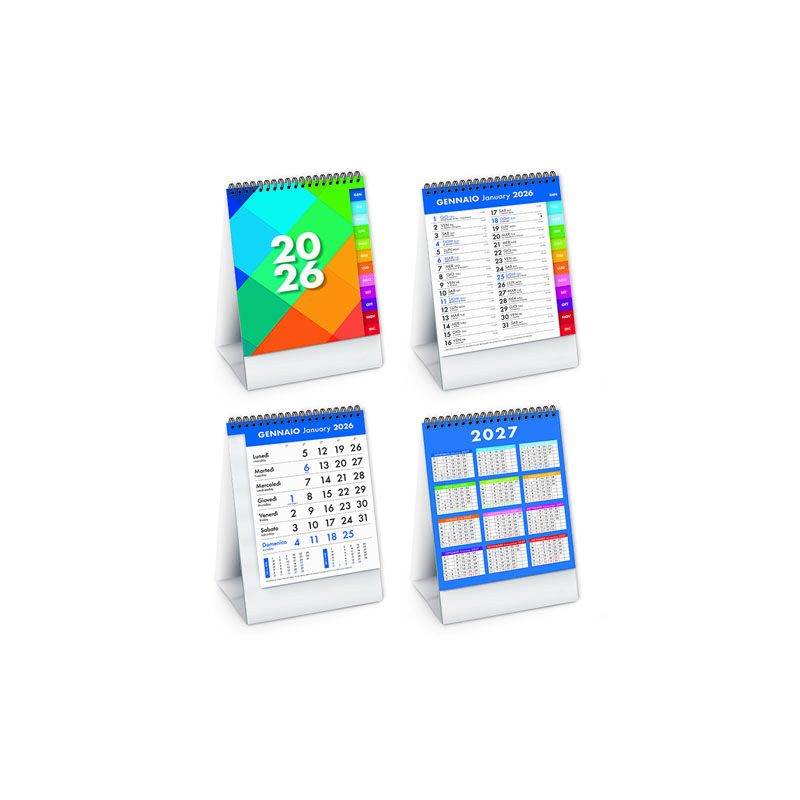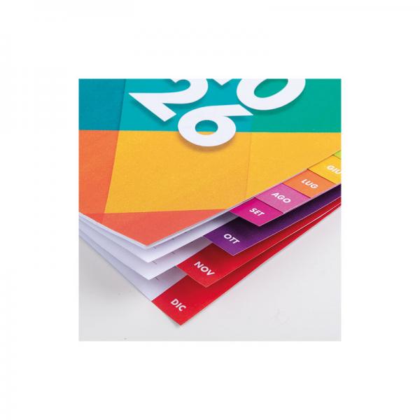 Calendario da tavolo sparlato mensile di 13 fogli fustellati, carta bianca 90 gr, supporto in cartoncino bianco 450 gr.
