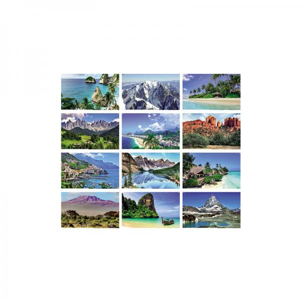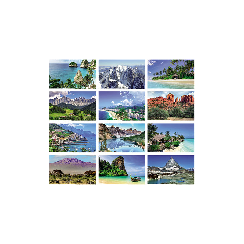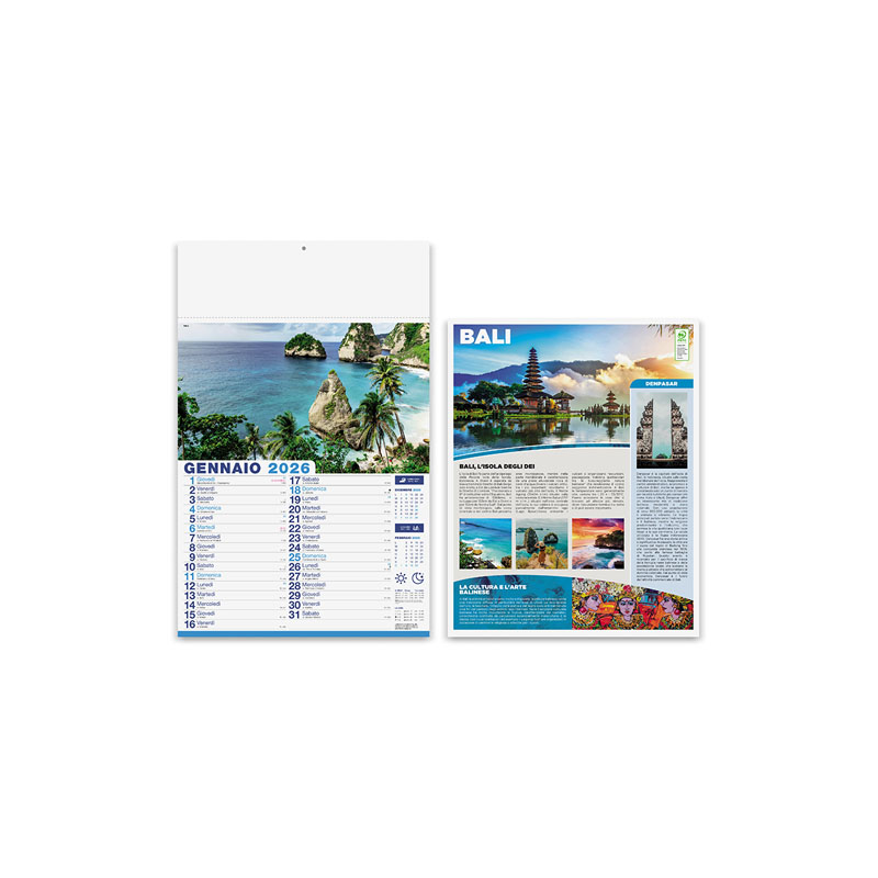 Calendario illustrato mensile 12 fogli, carta patinata 70 gr, testata termosaldata, certificazione PEFC.