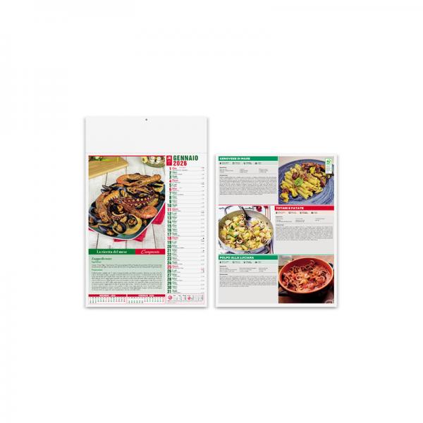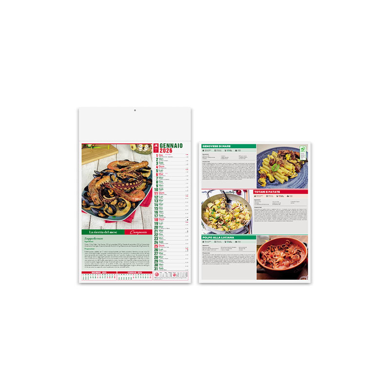 Calendario illustrato mensile 12 fogli, carta patinata 70 gr, testata termosaldata, certificazione PEFC.