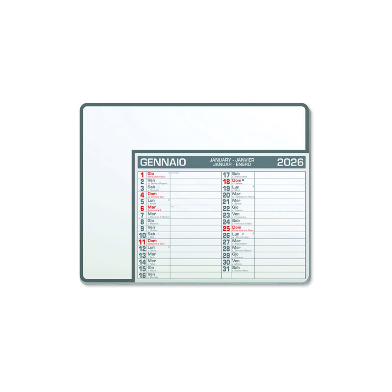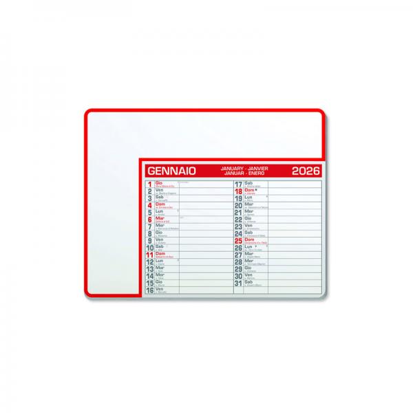 Tappetino mouse calendario 12 mesi con note, copertina rigida in pvc, base in eva, materiale: carta, pvc, eva.