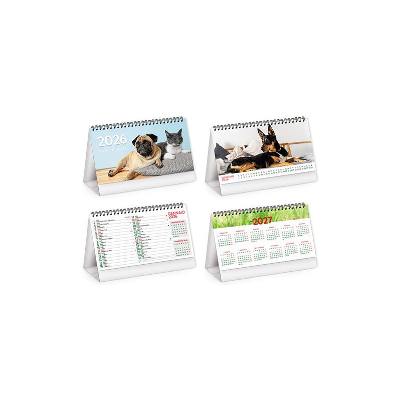 Calendario spiralato da tavolo illustrato mensile 13 fogli, carta patinata 100 gr, supporto cartoncino bianco.