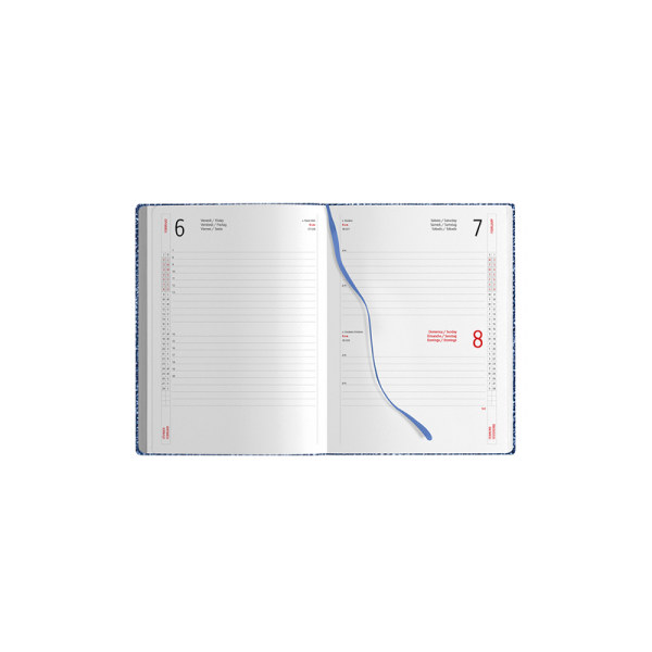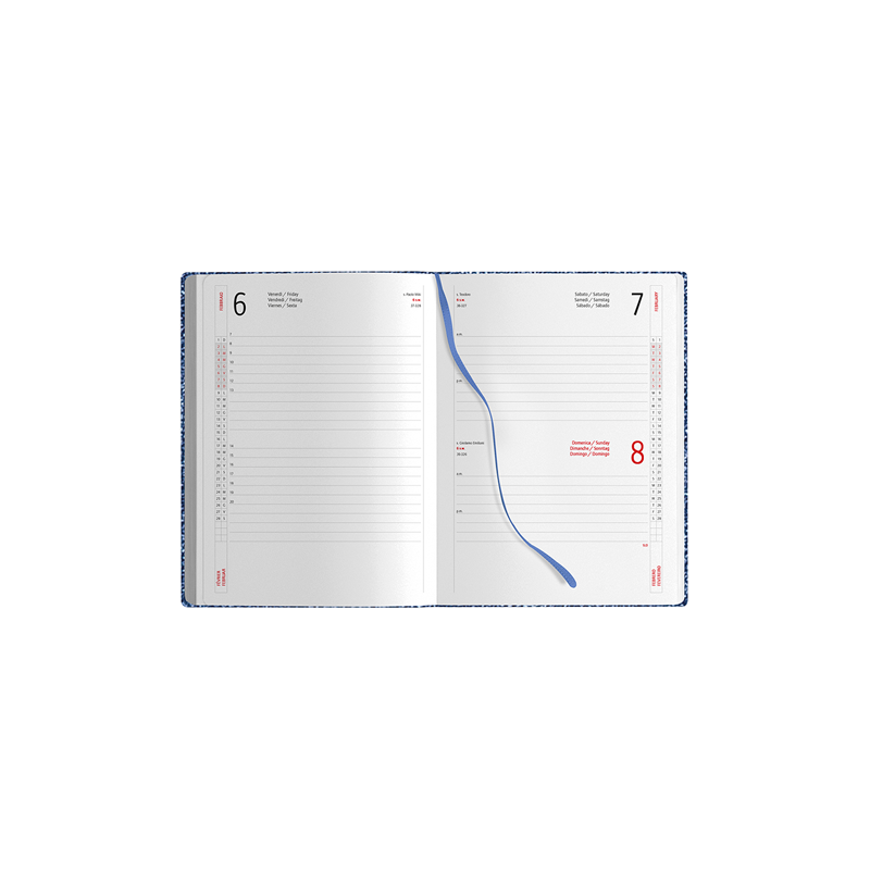 Agenda giornaliera 324 pagine con sabato e domenica abbinati, edizione multilingue: IT-GB-FR-DE-ES-PT, inserti informativi e rubrica telefonica, quadranti imbottiti, angoli tondi, inserto cartografico, segnapagine, chiusura con magnete, corredata di astuccio, tasca anteriore.