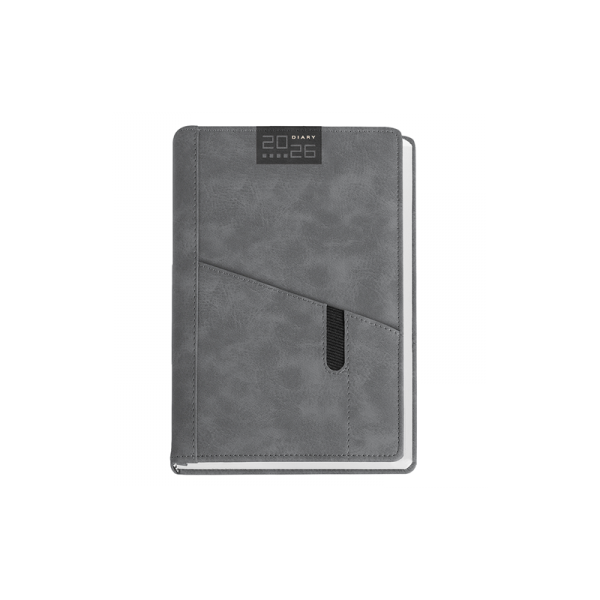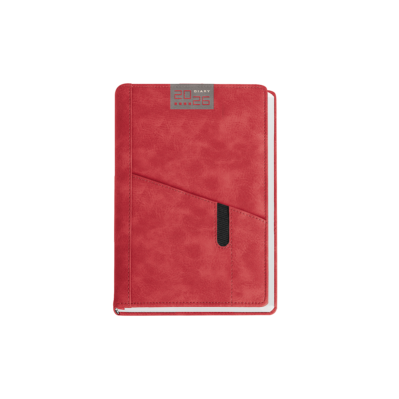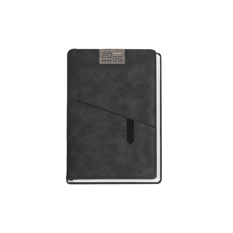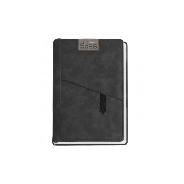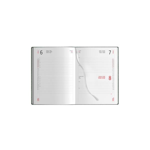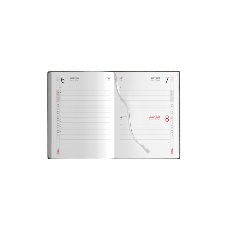 Agenda giornaliera 324 pagine con sabato e domenica abbinati, edizione multilingue: IT-GB-FR-DE-ES-PT, inserti informativi e rubrica telefonica, quadranti imbottiti, angoli tondi, inserto cartografico, segnapagine, chiusura con magnete, corredata di astuccio, tasca anteriore.