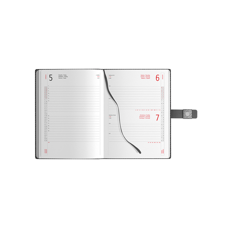 Agenda giornaliera 324 pagine, sabato e domenica abbinati, edizione multiligue IT - GB - FR - DE - ES - PT, inserti informativi e rubrica telefonica, inserto cartografico, angoli tondi, chiusura magnetica, asola portapenne, corredata di astuccio