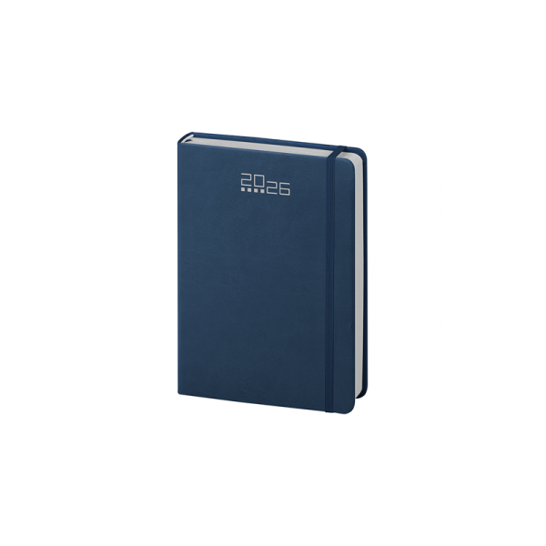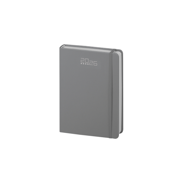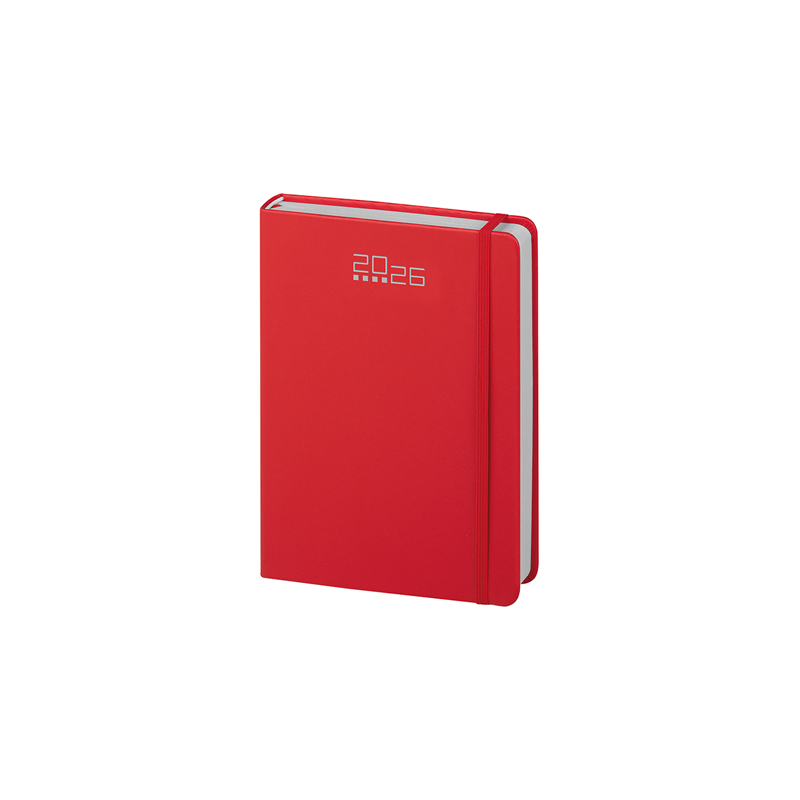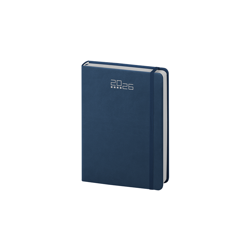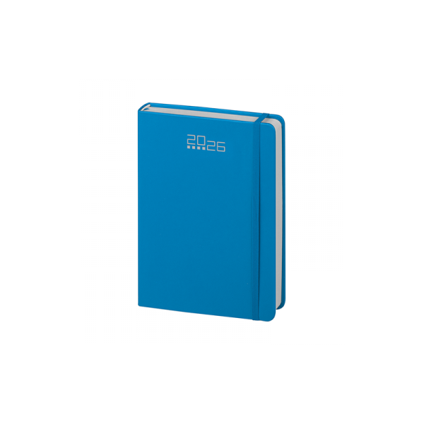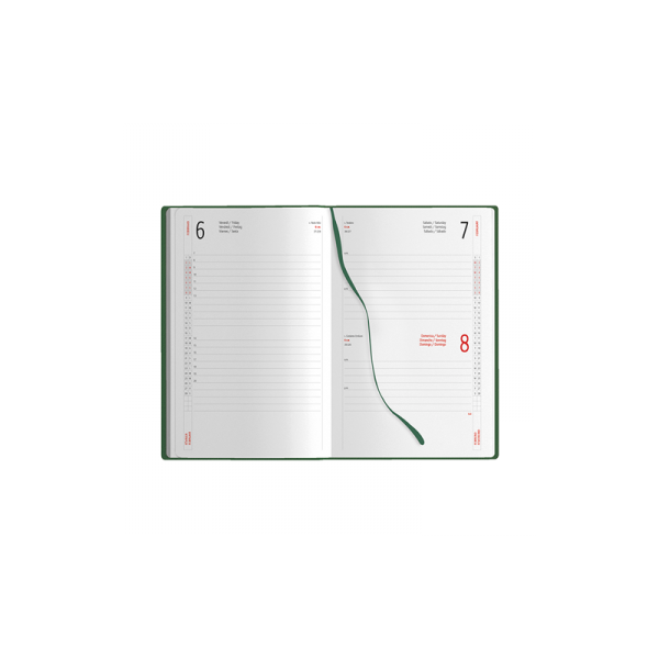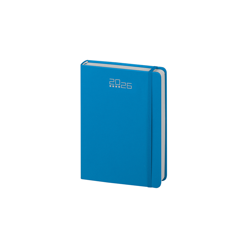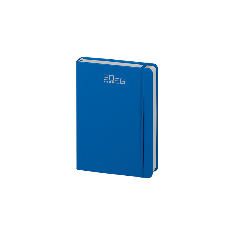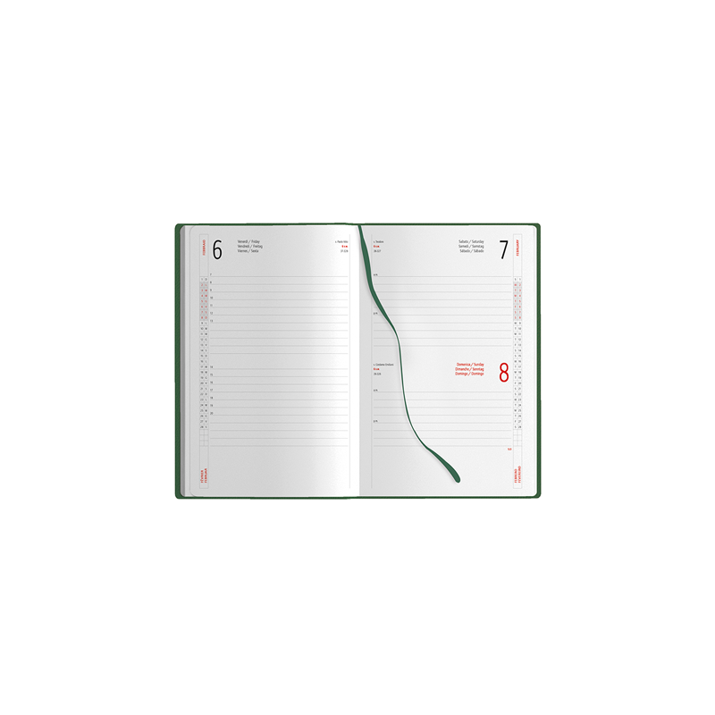 Agenda giornaliera 320 pagine con sabato e domenica abbinati, edizione multilingue IT - GB - FR - DE - ES - PT, elastico e segnapagine in tinta, inserti informativi e rubrica telefonica, angoli tondi.