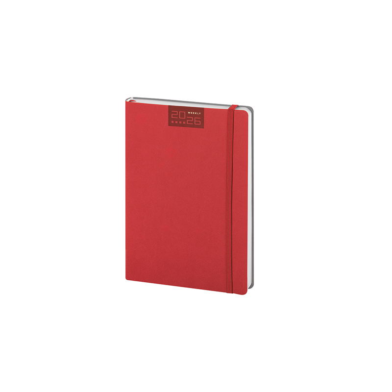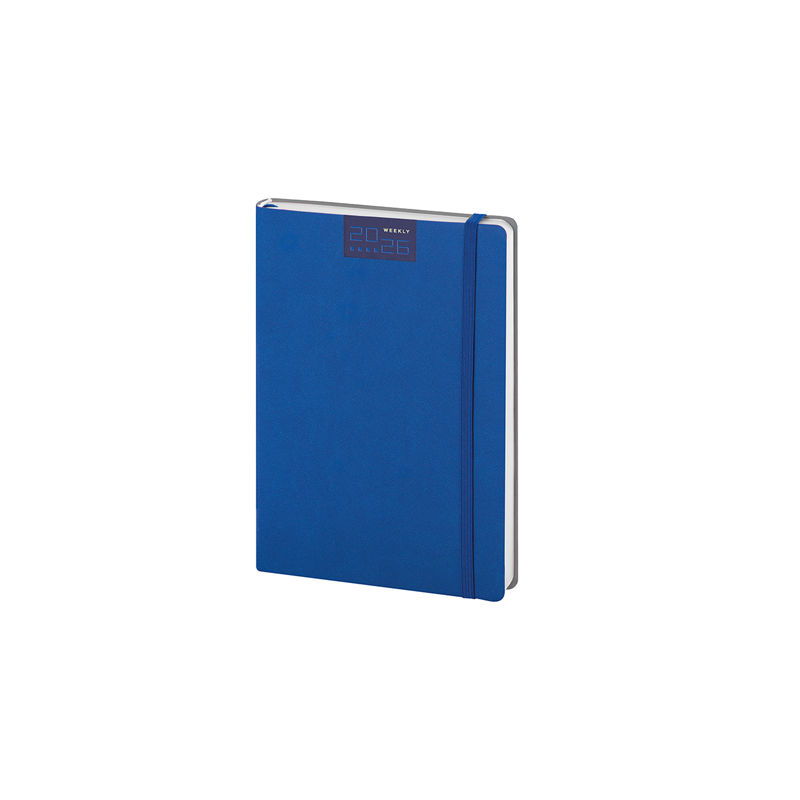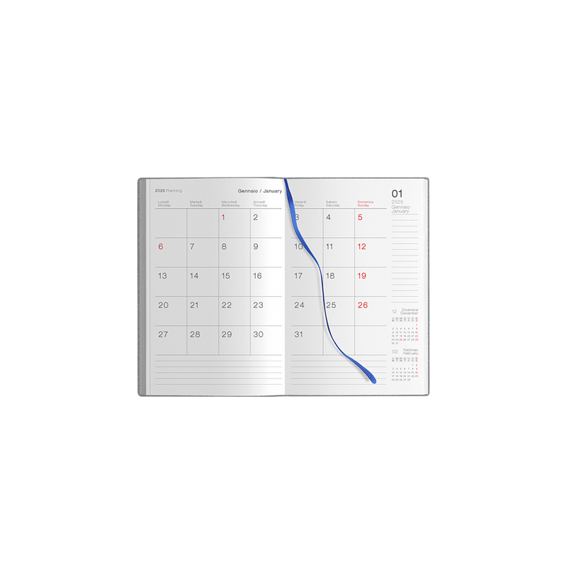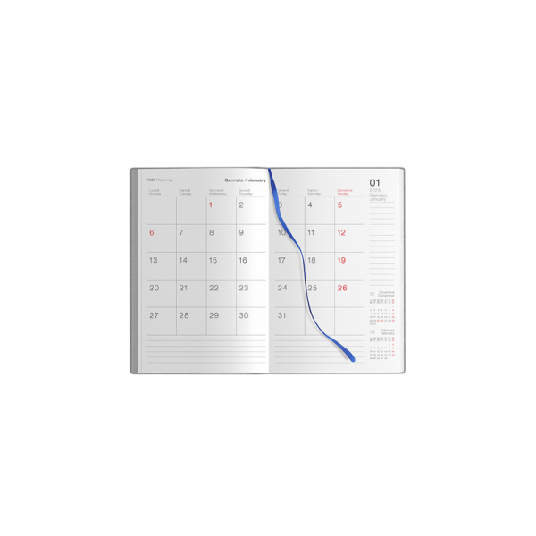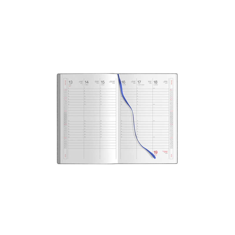Agenda settimanale flessibile 224 pagine, carta bianca, edizione multilingue, planning mensile, rubrica telefonica, pagine appunti a quadretti, puntini e bianche.