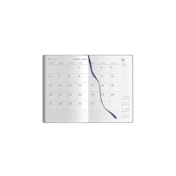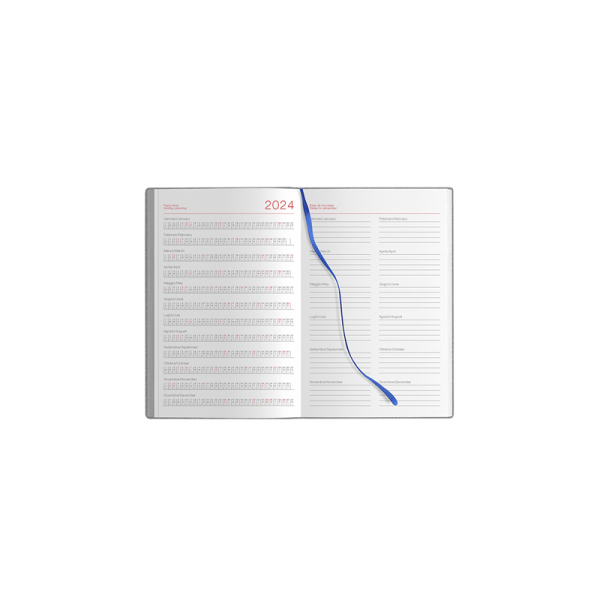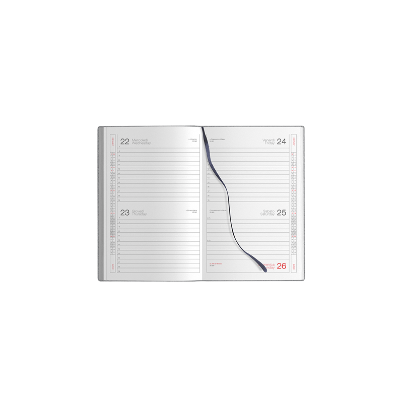 Agenda bi-giornaliera flessibile 224 pagine, carta bianca, edizione multilingue, planning mensile, rubrica telefonica, pagine appunti a quadretti, puntini e bianche.