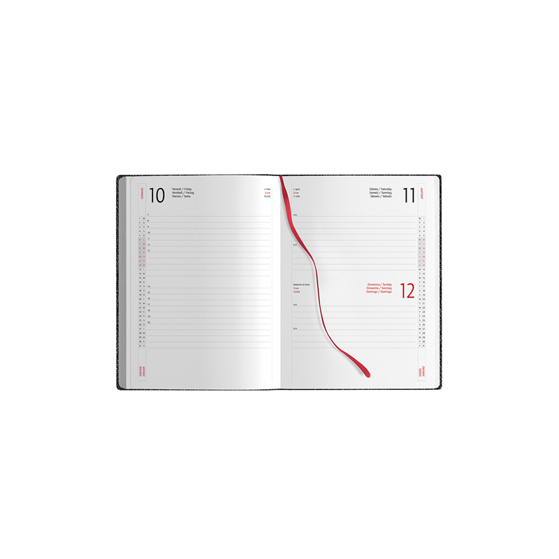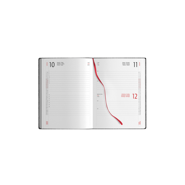 Agenda giornaliera 324 pagine sabato e domenica abbinati, edizione multilingue (italiano, inglese, tedesco, spagnolo, portoghese), quadranti imbottiti con angoli tondi, chiusura magnetica, segnapagine, inserti informativi e rubrica telefonica, inserto cartografico, corredata di astuccio.