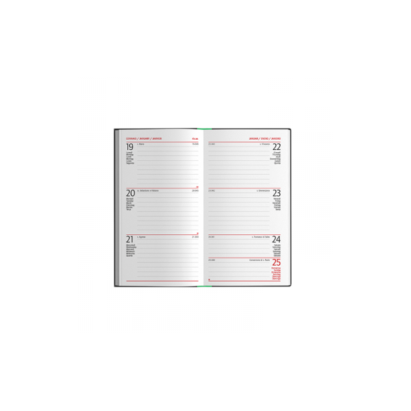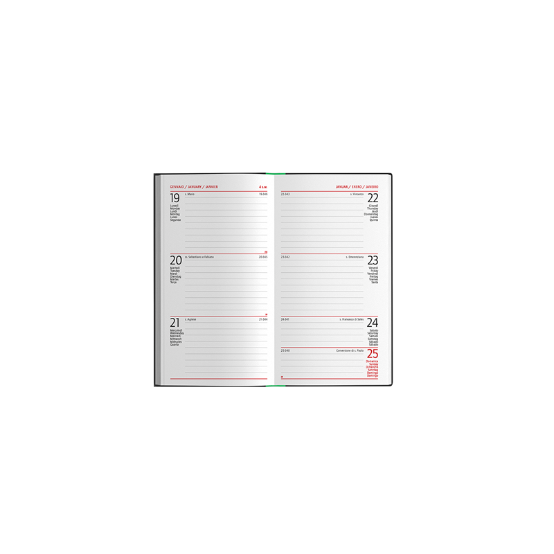 Agenda tascabile settimanale con 136 pagine, edizione multilingue (italiano, inglese, francese, tedesco, spagnolo, portoghese), inserti infomativi e rubrica telefonica, inserto cartografico, turnario 2025