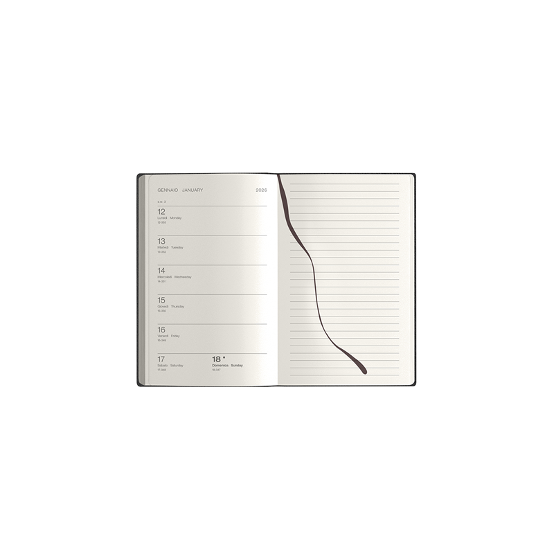 Agende flessibili con 150 pagine settimanali, carta avorio, edizione multilingue (italiano, inglese), planning mensile, travel planning, inserti informativi, turnario del lavoratore, pagine appunti a righe, puntini e bianche, 2 foglietti con stickers.