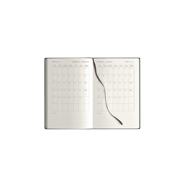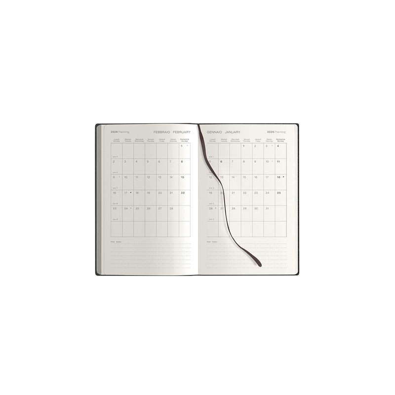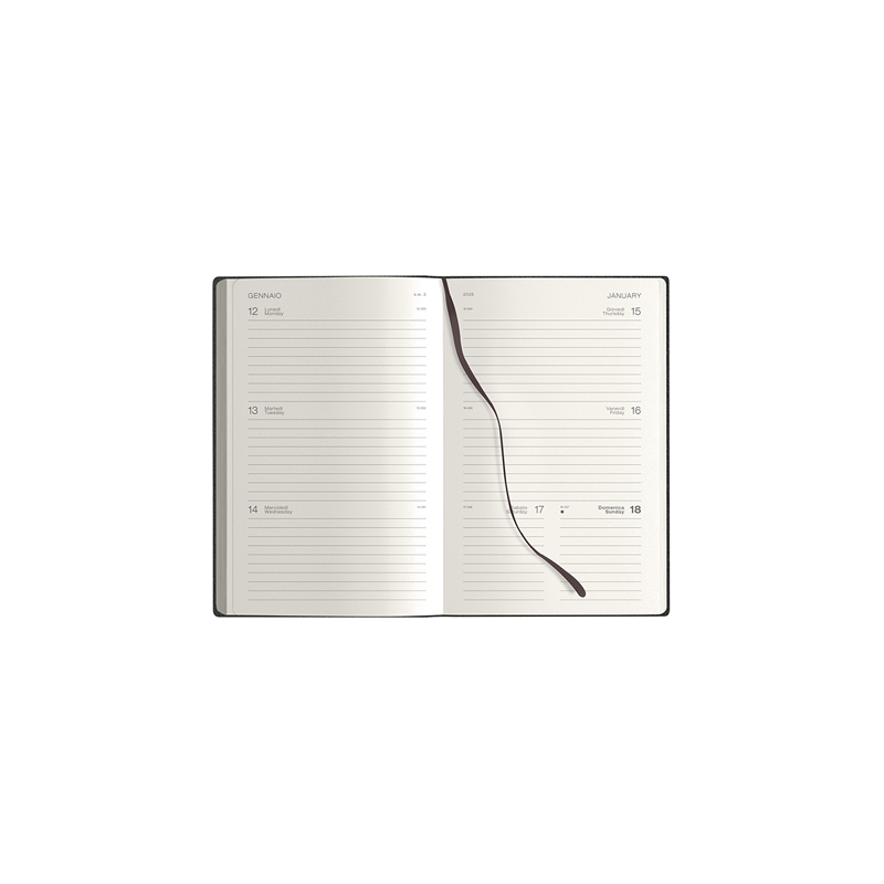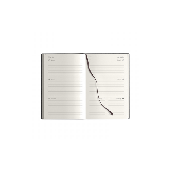 Agende flessibili con 150 pagine settimanali, carta avorio, edizione multilingue (italiano, inglese), planning mensile, travel planning, inserti informativi, turnario del lavoratore, pagine appunti a righe, puntini e bianche, 2 foglietti con stickers.