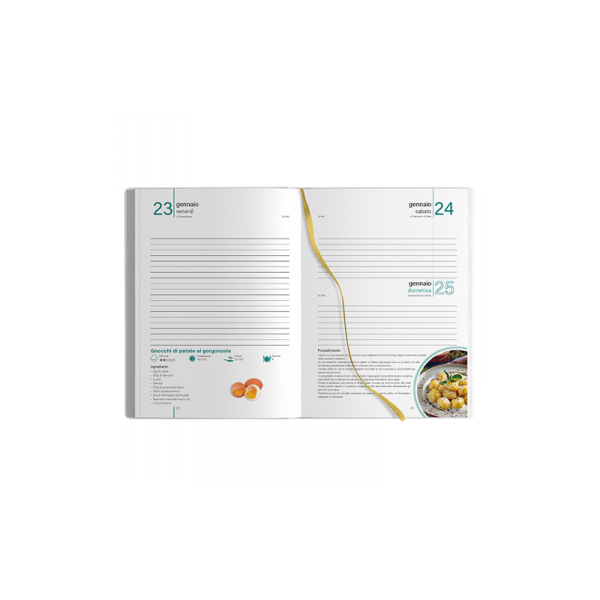 Agenda giornaliera 352 pagine sabato e domenica abbinati, carta bianca stampata in quadricromia, quadranti imbottiti, edizione in italiano, segnapagine, inserti informativi, riepilogo di cassa