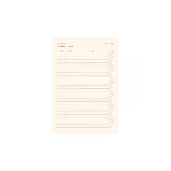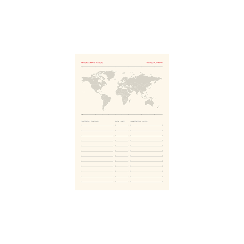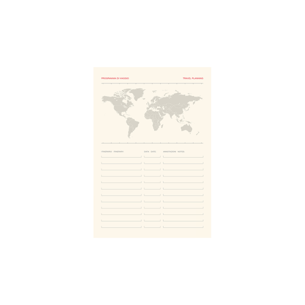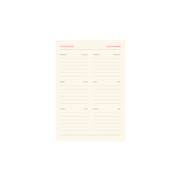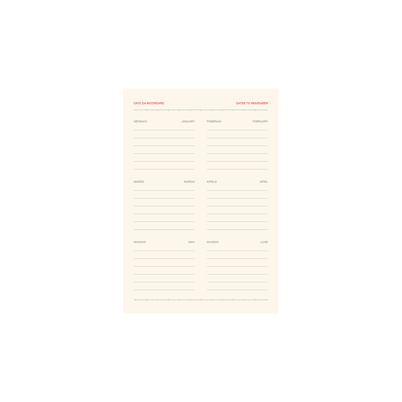 Agenda 324 pagine non datate, 12 pag. planning mensile, 12 pag appuntamenti, 2 pag. date da ricordare, 2 pag. programma di viaggio, pagine finali per note, carta avorio, stampa a 2 colori, bilingue: IT - GB, segnapgine, chiusura con elastico.