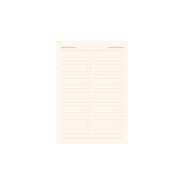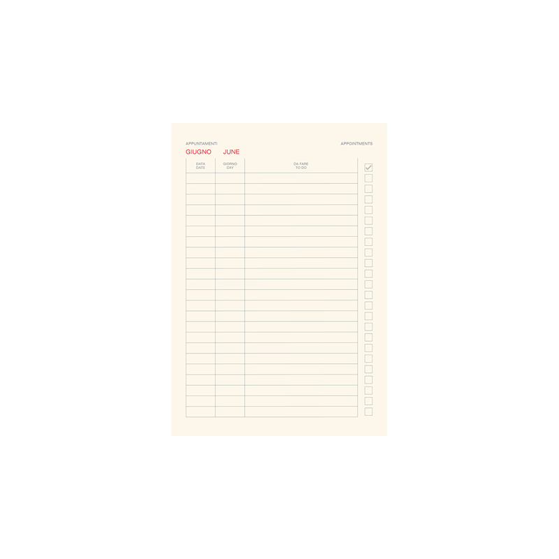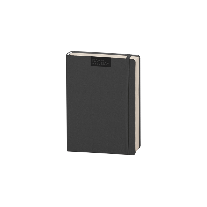 Agenda 324 pagine non datate, 12 pag. planning mensile, 12 pag appuntamenti, 2 pag. date da ricordare, 2 pag. programma di viaggio, pagine finali per note, carta avorio, stampa a 2 colori, bilingue: IT - GB, segnapgine, chiusura con elastico.