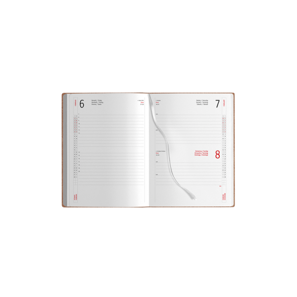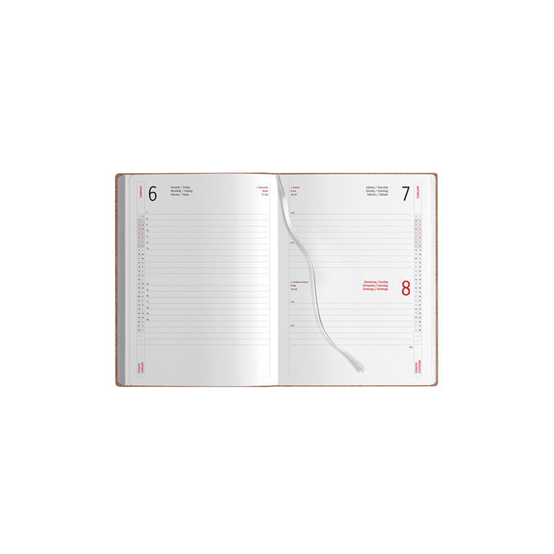 Agenda da 324 pagine con sabato e domenica abbinati, carta bianca con stampa a 2 colori.