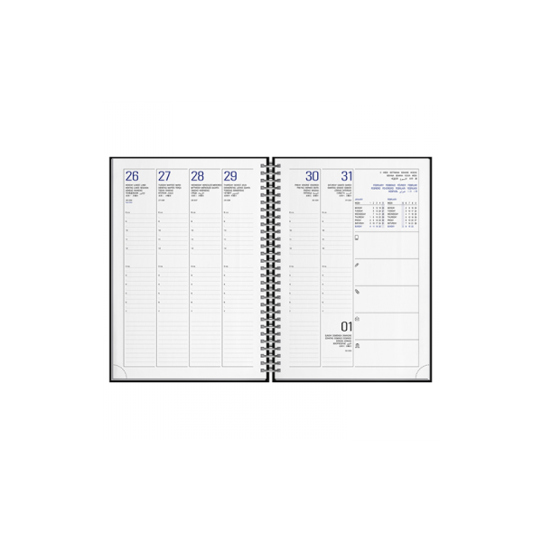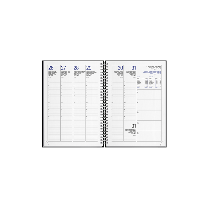 Agenda settimanale da 128 pagine, carta bianca con stampa a 2 colori.