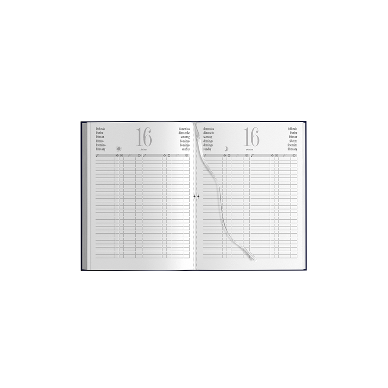 Agenda da 576 pagine con venerdì, sabato, domenica e festivi in doppia pagina, carta bianca con stampa a 2 colori.