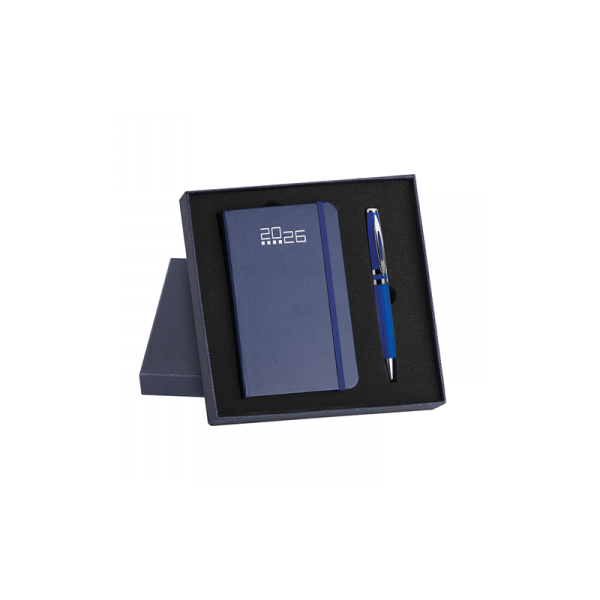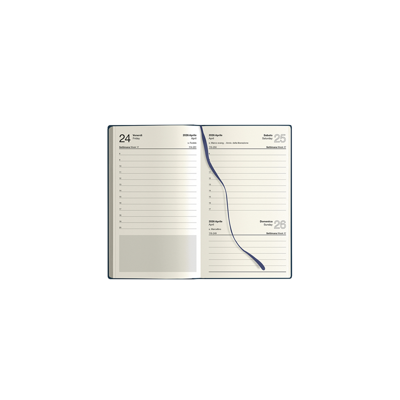 Edizione multilingue, tasca posteriore interna, segnapagine, quadranti con angoli tondi, chiusura con elastico, corredata di penna e scarola.