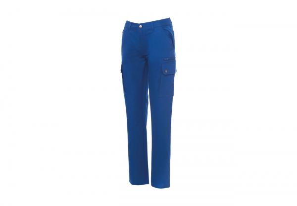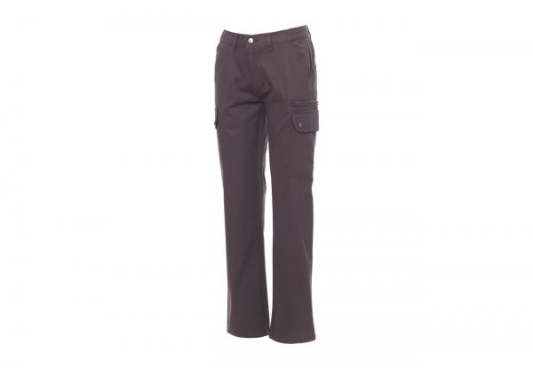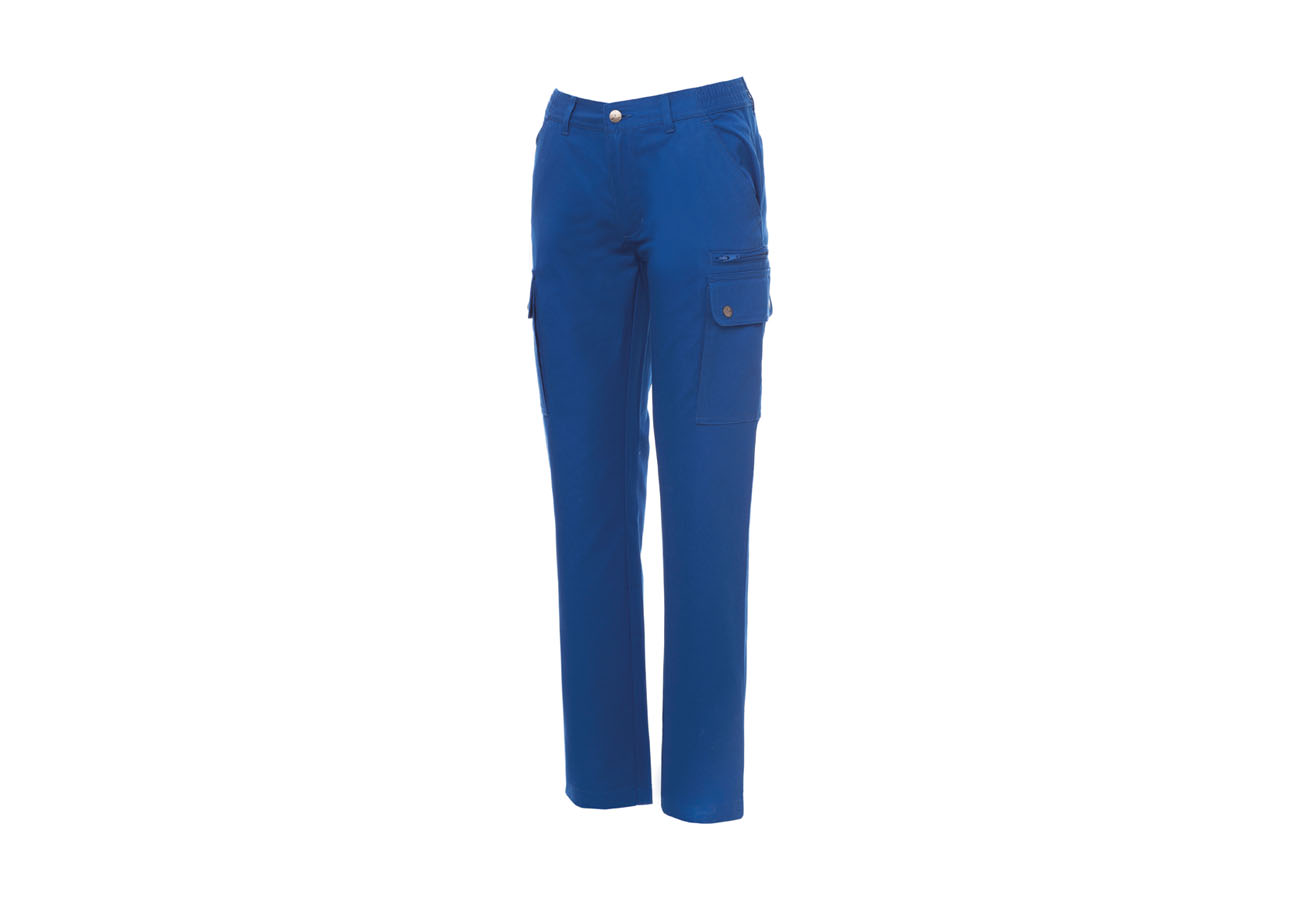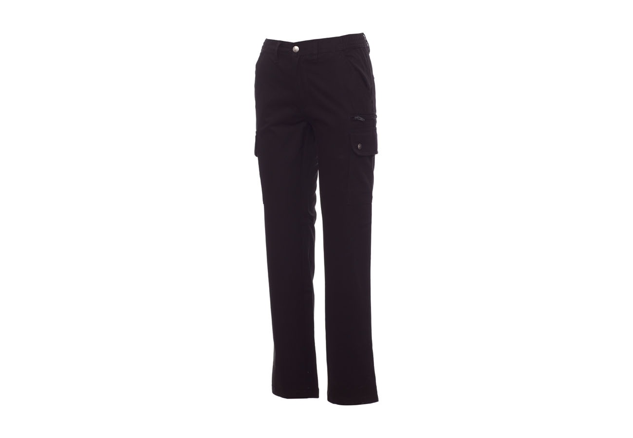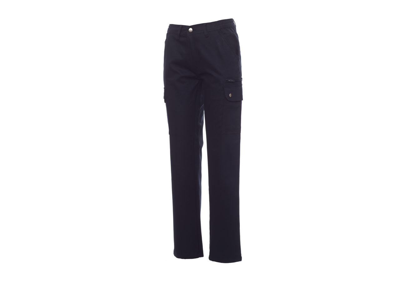 Pantalone donna, taglio classico, multistagione, elastici laterali e passanti in vita, chiusura con zip e bottone in metallo, due tasche anteriori a taglio classico, due tasche laterali con patta e bottoni automatici, una tasca con zip lato sinistro, un portametro a scomparsa lato destro, due tasche posteriori a filo con asola e bottone.
