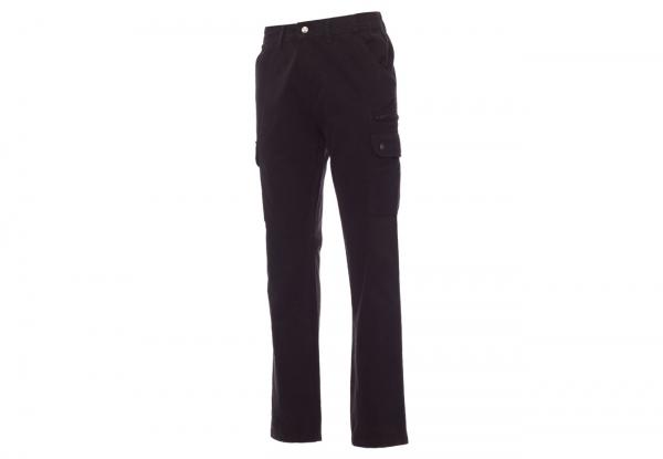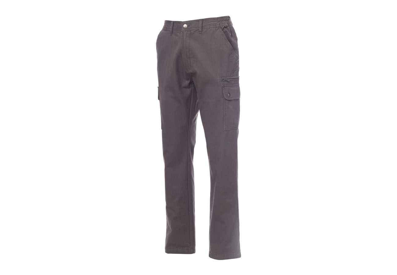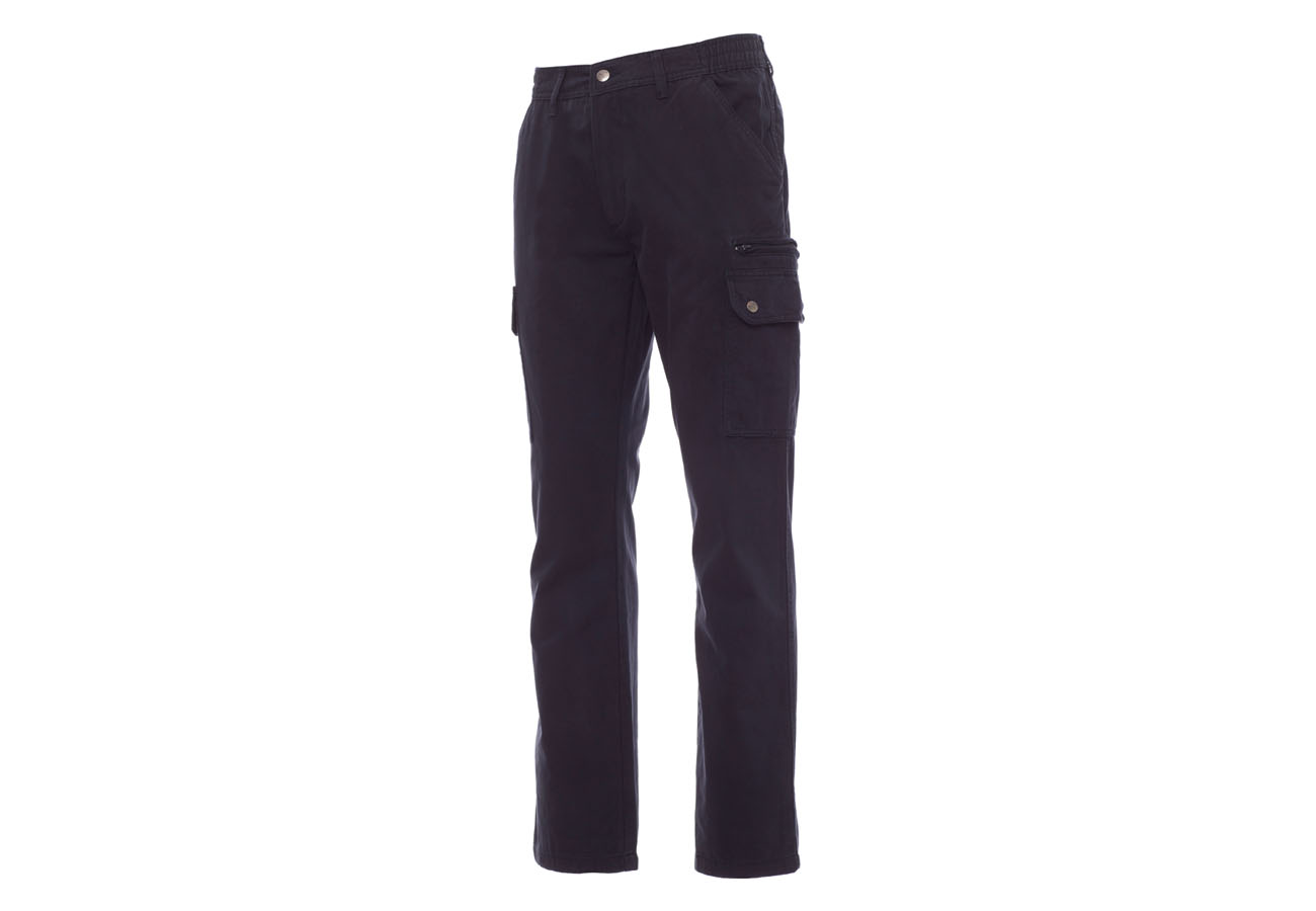 Pantalone uomo, invernale, elastici laterali e passanti in vita, chiusura con zip e bottone in metallo, due tasche anteriori a taglio classico, due tasche laterali con patta e bottoni automatici, una tasca con zip lato sinistro, un portametro a scomparsa lato destro, due tasche posteriori a filo con asola e bottone.