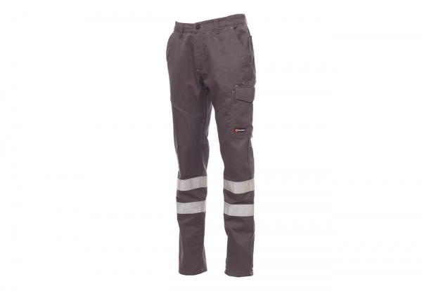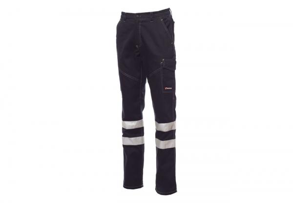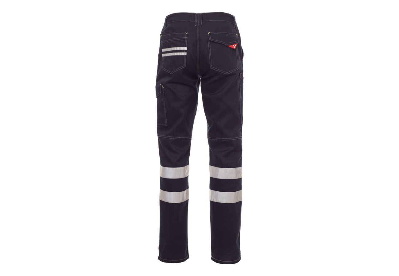 Pantalone unisex, multistagione, con bande riflettenti in cat.1, elastici laterali e passanti in vita, chiusura con zip e bottone in plastica, due tasche anteriori a taglio classico, una tasca laterale LOCK SYSTEM, un porta metro, due tasche posteriori una aperta e una con patta e velcro, inserti ed impuntare a contrasto, bande reflex su tasca posteriore, cuciture triple.