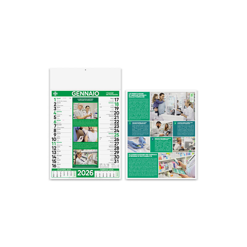 Calendario illustrato 12 fogli, carta patinata 70 gr, testata termosaldata, certificazione PEFC