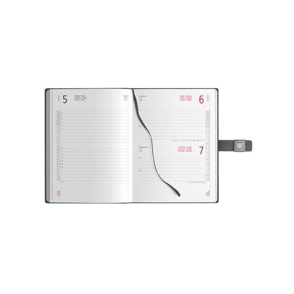 Agenda giornaliera 324 pagine, sabato e domenica abbinati, edizione multiligue IT - GB - FR - DE - ES - PT, inserti informativi e rubrica telefonica, inserto cartografico, angoli tondi, chiusura magnetica, asola portapenne, corredata di astuccio
