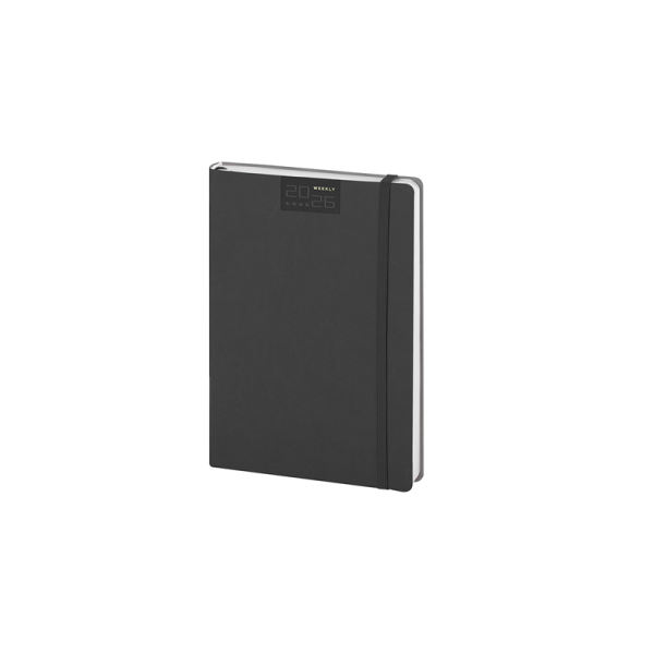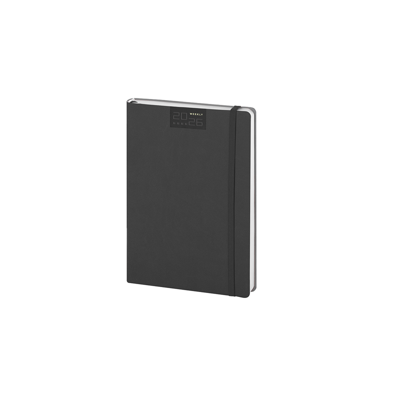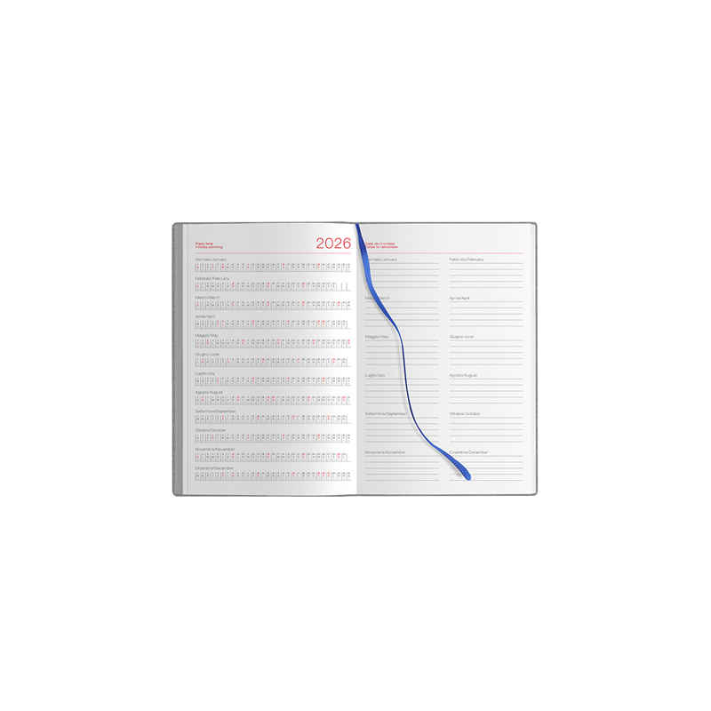 Agenda settimanale flessibile 224 pagine, carta bianca, edizione multilingue, planning mensile, rubrica telefonica, pagine appunti a quadretti, puntini e bianche.