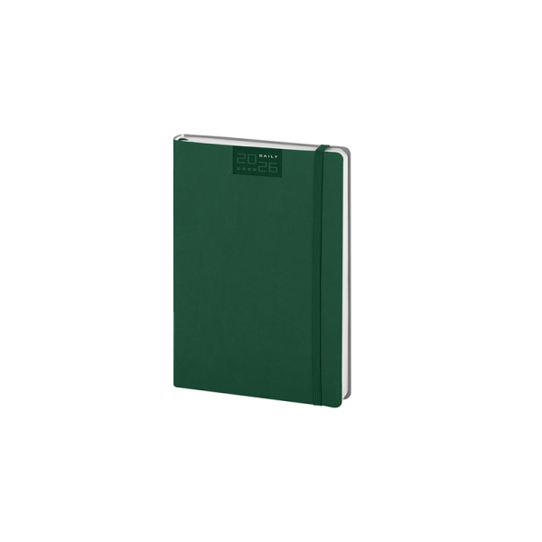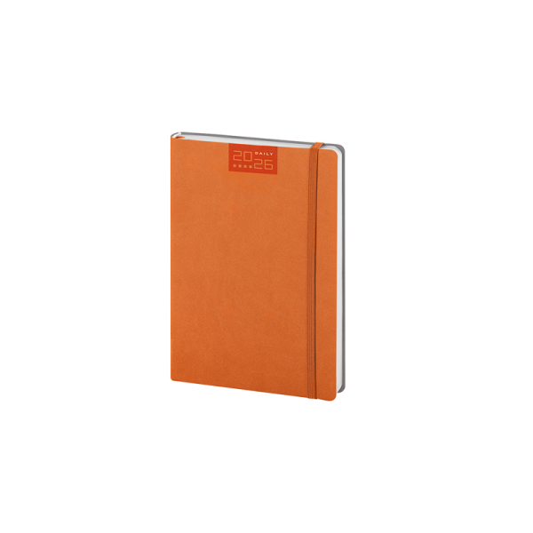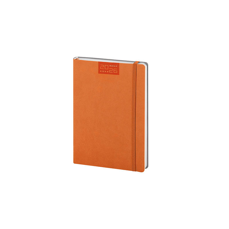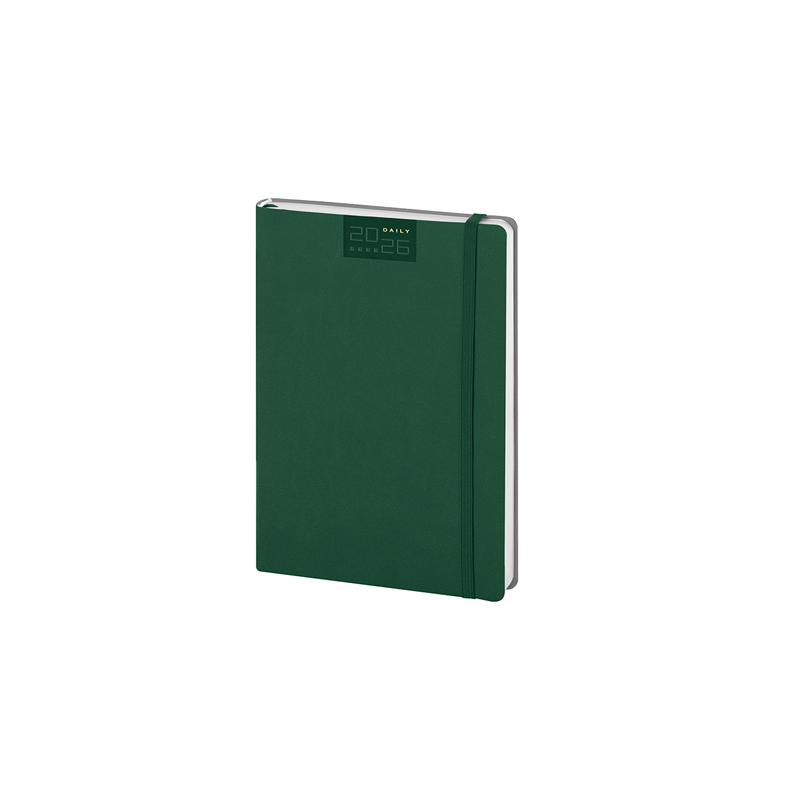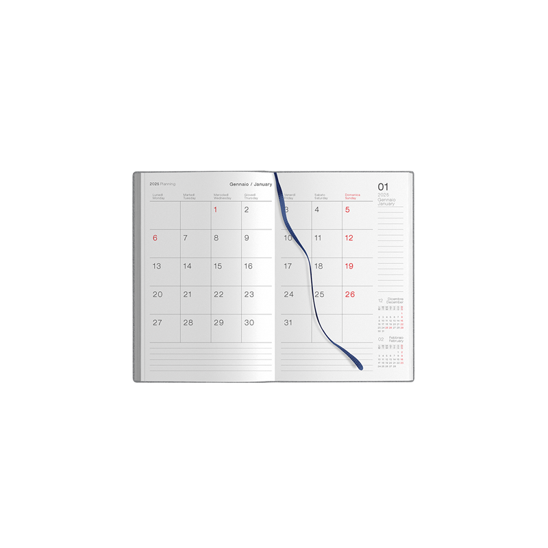 Agenda bi-giornaliera flessibile 224 pagine, carta bianca, edizione multilingue, planning mensile, rubrica telefonica, pagine appunti a quadretti, puntini e bianche.