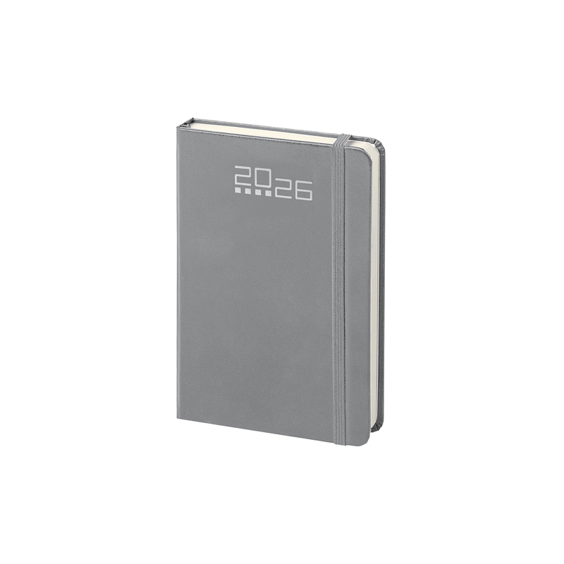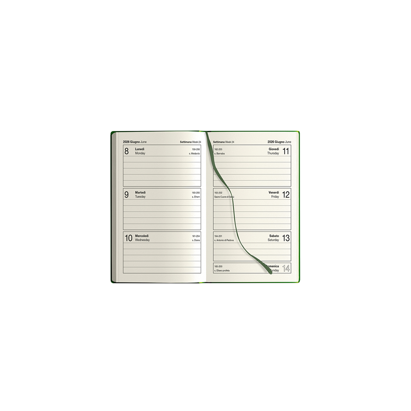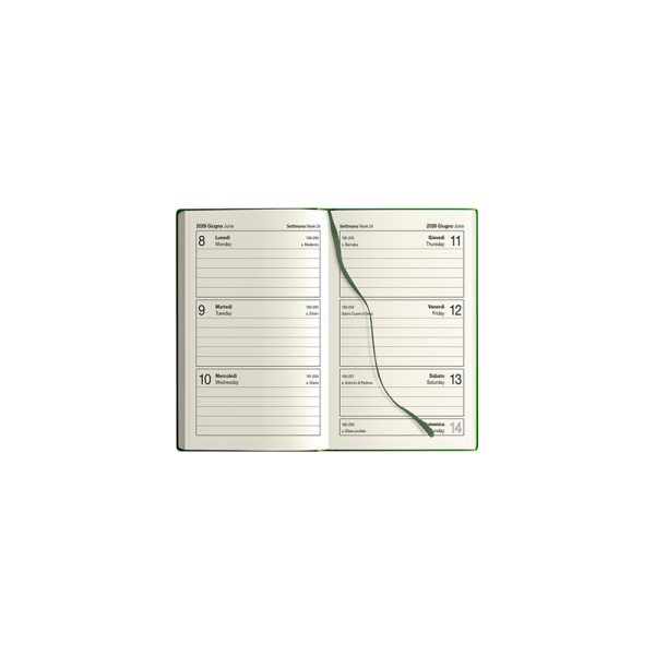 Agenda settimanale 192 pagine (128 pag. agenda, 12 pag. turnario del lavoratore, 20 pag. per note, 16 pag. con perforatura verticale removibile, 16 pag. talloncini removibili con doppia perforatura), carta avorio, stampa a 1 colore, edizione multilibgue, inserti informativi, tasca posteriore interna p/card, quadranti con angoli tondi, segnapagine, chiusura con elastico.