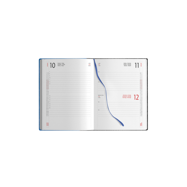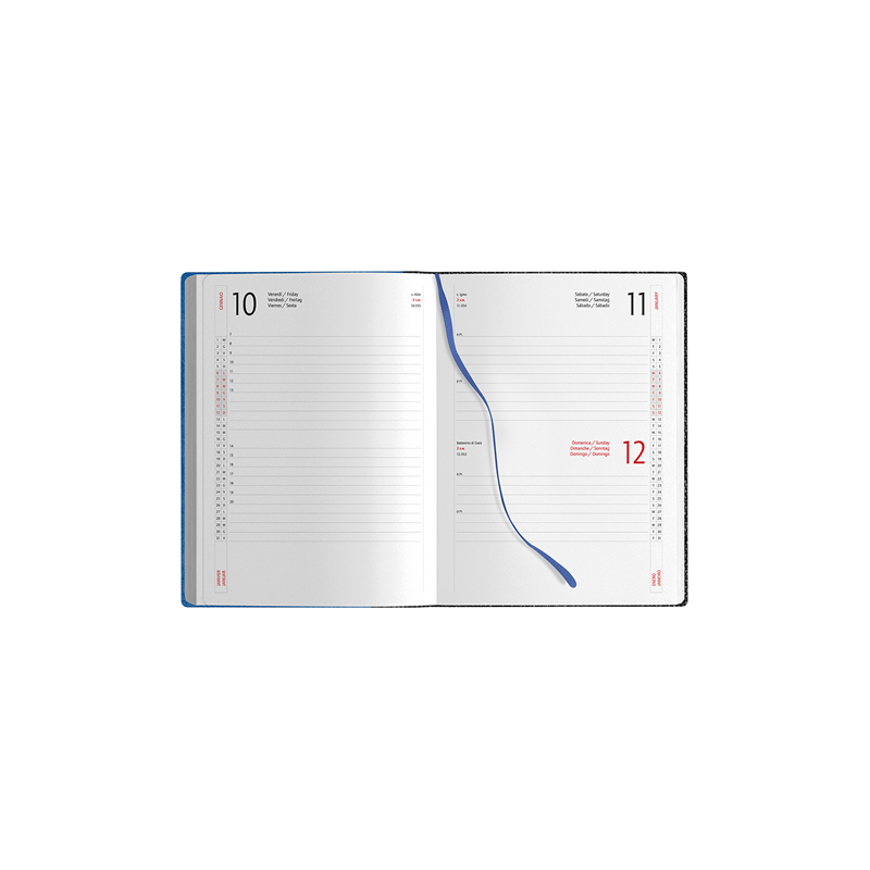 Agenda giornaliera 324 pagine sabato e domenica abbinati, edizione multilingue (italiano, inglese, tedesco, spagnolo, portoghese), quadranti imbottiti con angoli tondi, portapenne, segnapagine, inserti informativi e rubrica telefonica, inserto cartografico, corredata di astuccio.