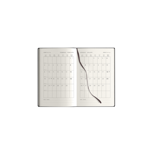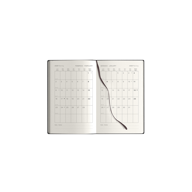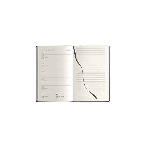 Agende flessibili con 150 pagine settimanali, carta avorio, edizione multilingue (italiano, inglese), planning mensile, travel planning, inserti informativi, turnario del lavoratore, pagine appunti a righe, puntini e bianche, 2 foglietti con stickers.