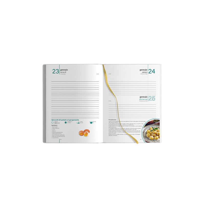 Agenda giornaliera 352 pagine sabato e domenica abbinati, carta bianca stampata in quadricromia, quadranti imbottiti, edizione in italiano, segnapagine, inserti informativi, riepilogo di cassa