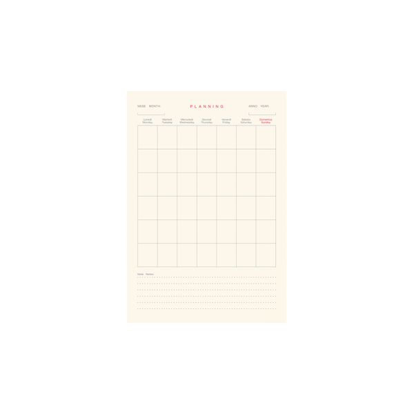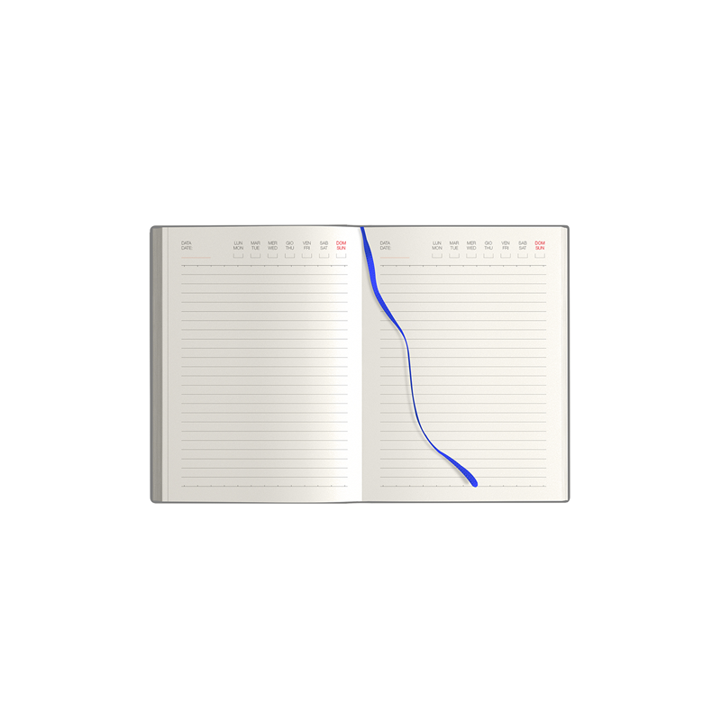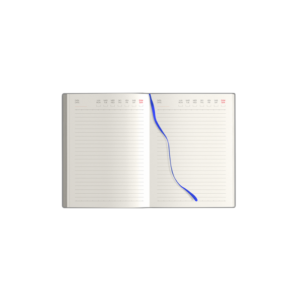 Agenda 324 pagine non datate, 12 pag. planning mensile, 12 pag appuntamenti, 2 pag. date da ricordare, 2 pag. programma di viaggio, pagine finali per note, carta avorio, stampa a 2 colori, bilingue: IT - GB, segnapgine, chiusura con elastico.