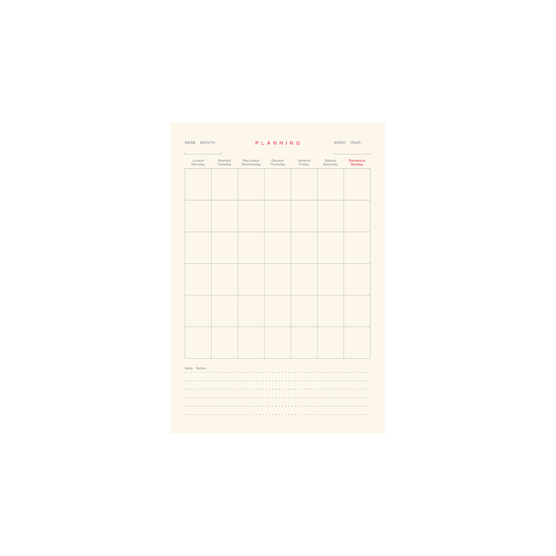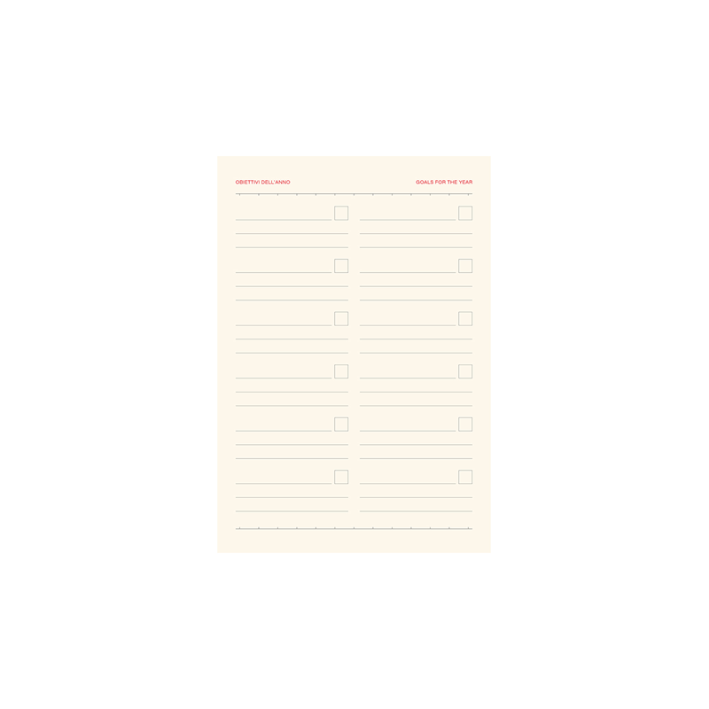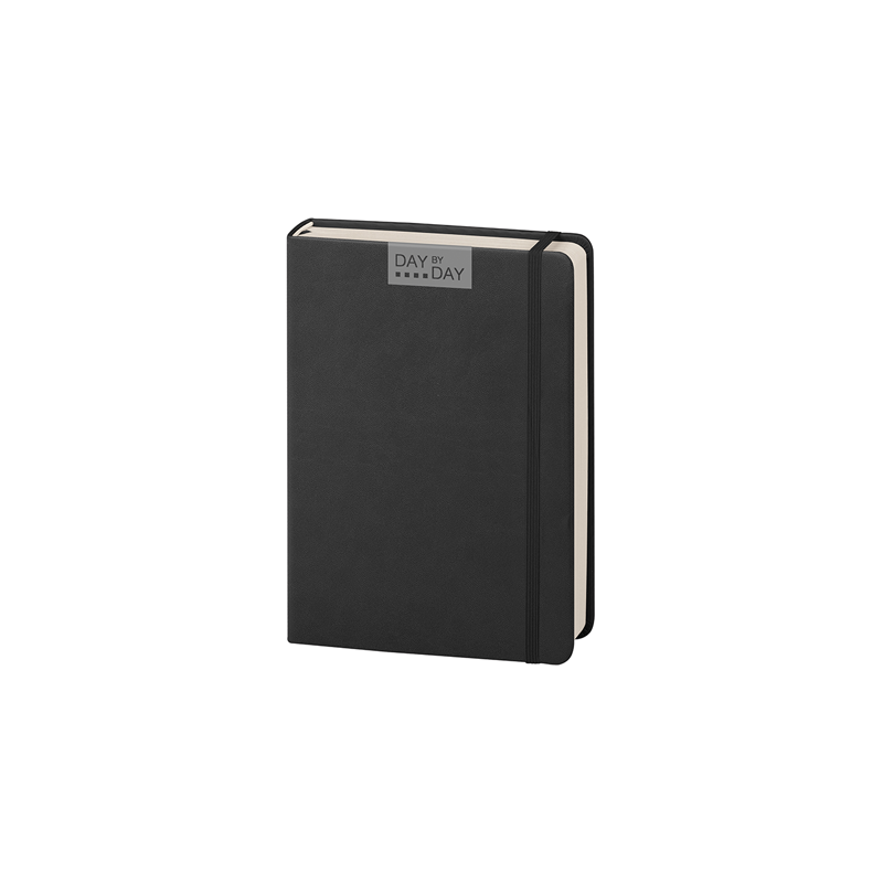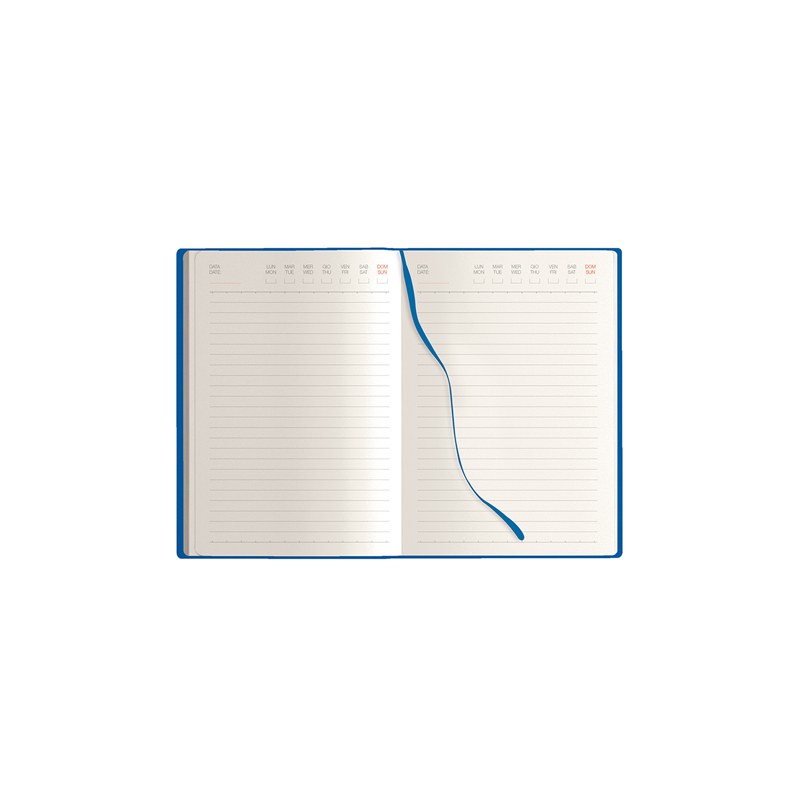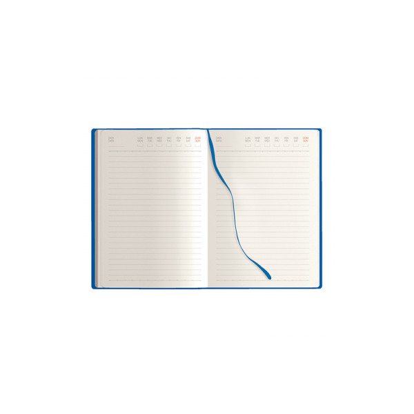 Agenda 324 pagine non datate, 12 pag. planning mensile, 12 pag appuntamenti, 2 pag. date da ricordare, 2 pag. programma di viaggio, pagine finali per note, carta avorio, stampa a 2 colori, bilingue: IT - GB, segnapgine, chiusura con elastico.