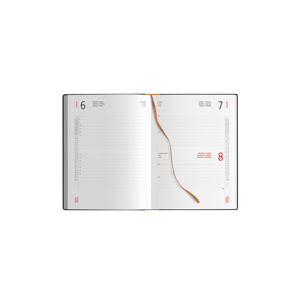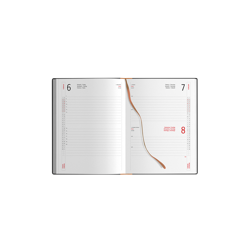 Agenda da 324 pagine con sabato e domenica abbinati, carta bianca con stampa a 2 colori.