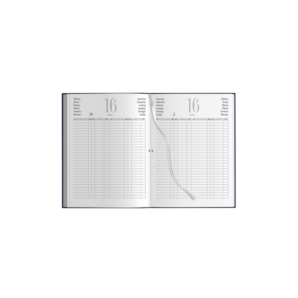 Agenda da 576 pagine con venerdì, sabato, domenica e festivi in doppia pagina, carta bianca con stampa a 2 colori.