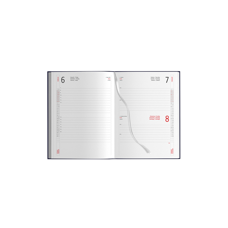 Agenda da 324 pagine con sabato e domenica abbinati, carta bianca con stampa a 2 colori.