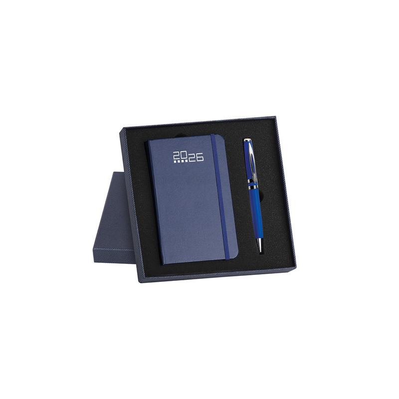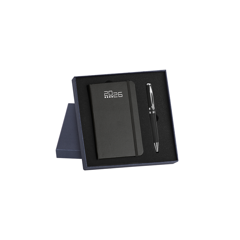 Edizione multilingue, tasca posteriore interna, segnapagine, quadranti con angoli tondi, chiusura con elastico, corredata di penna e scarola.