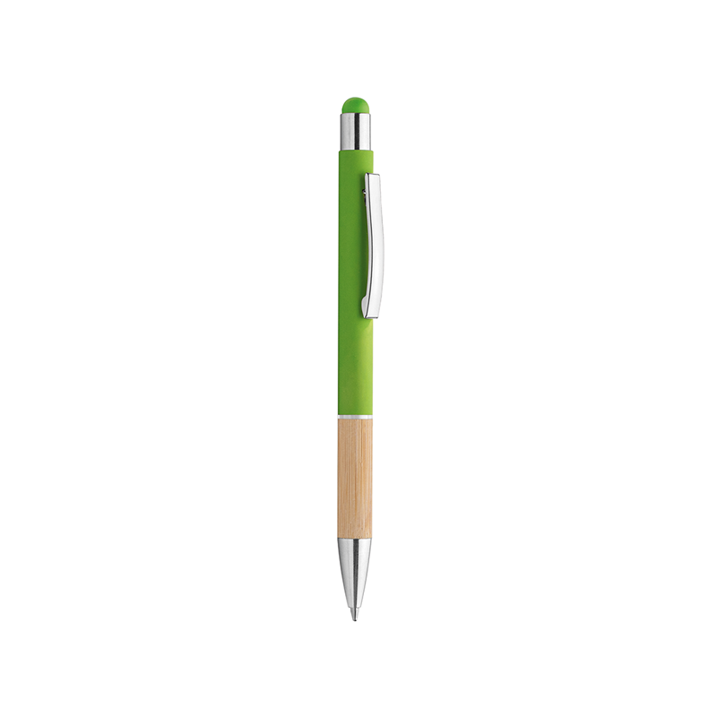 Penna in metallo, fusto in materiale gommato, grip in bamboo, gommino touch, anello trasparente, refill nero, minuterie in metallo cromato