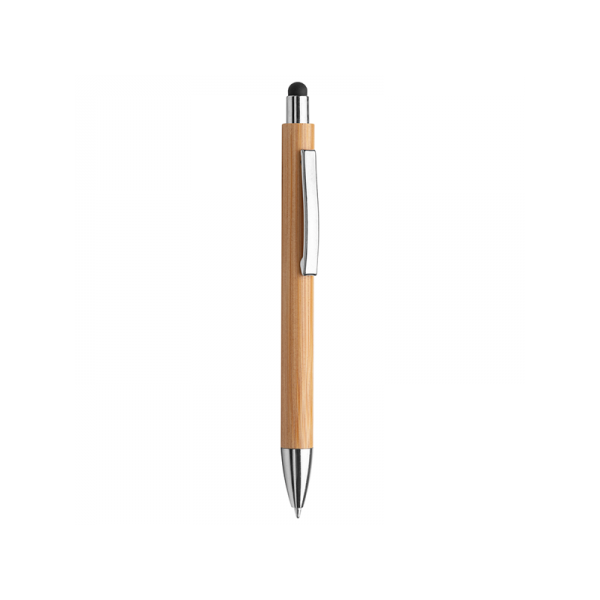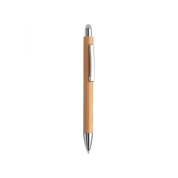 Penna in bamboo, refill nero, minuterie in metallo cromato, gommino per touch screen