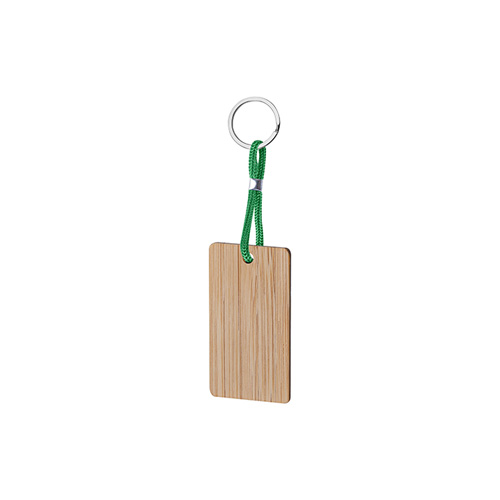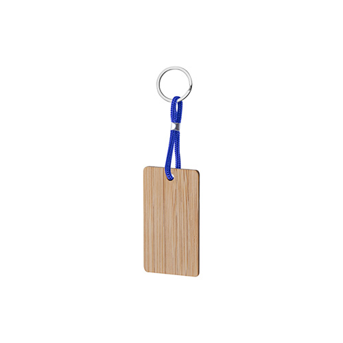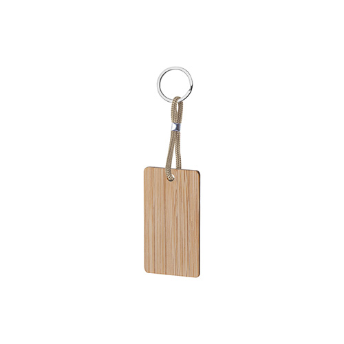 Portachiavi in legno, corpo rettangolare, anello piatto, cordoncino colorato.