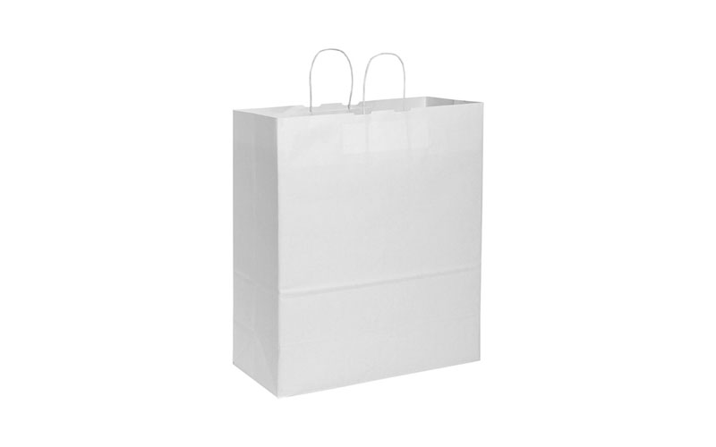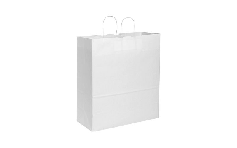 Shopper con soffietto, maniglia ritorta, carta kraft bianca.