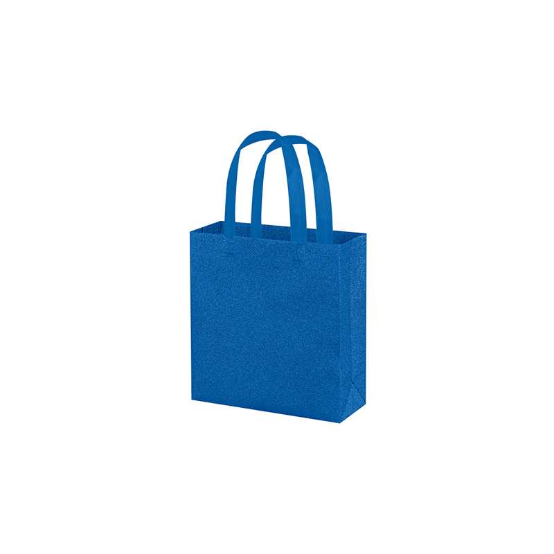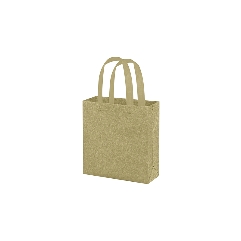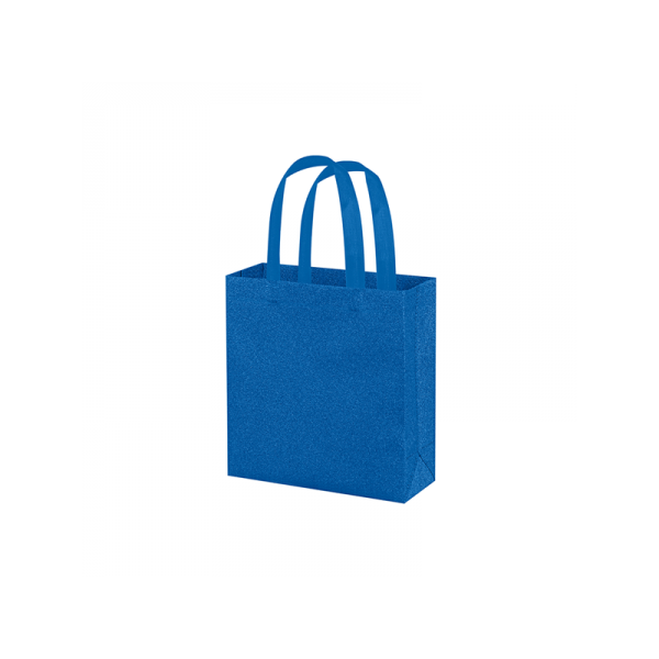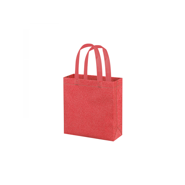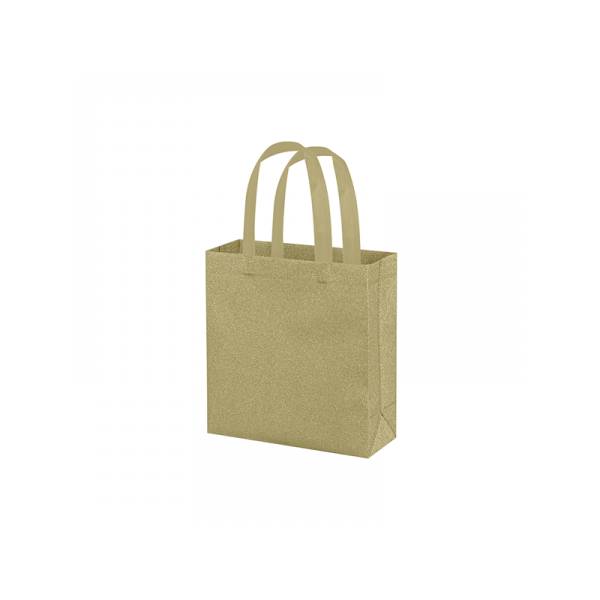 borsa shopping TNT glitter, soffietto, manici corti, rifiniture termosaldate, colori glitterati.