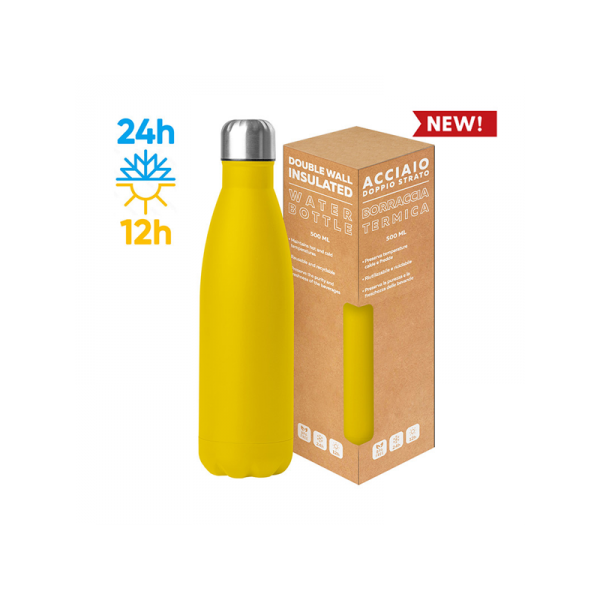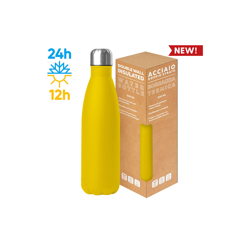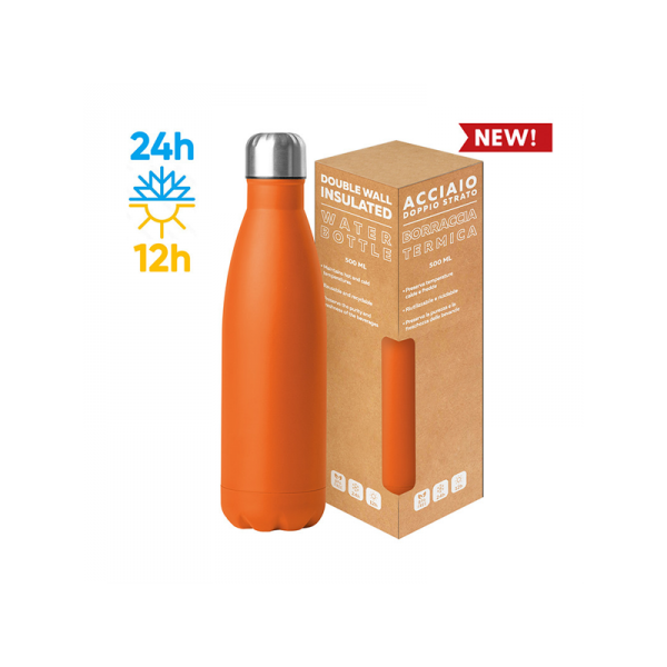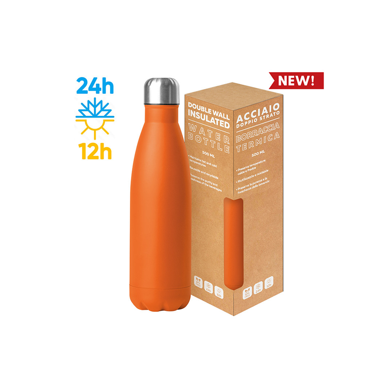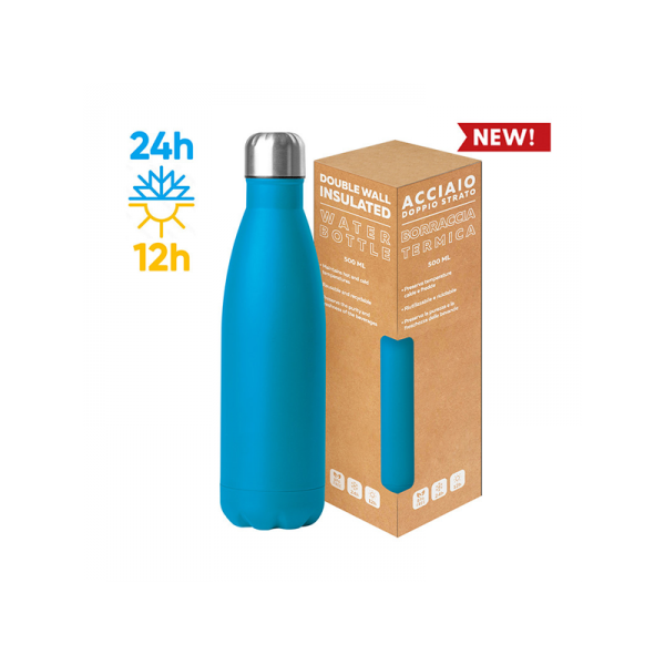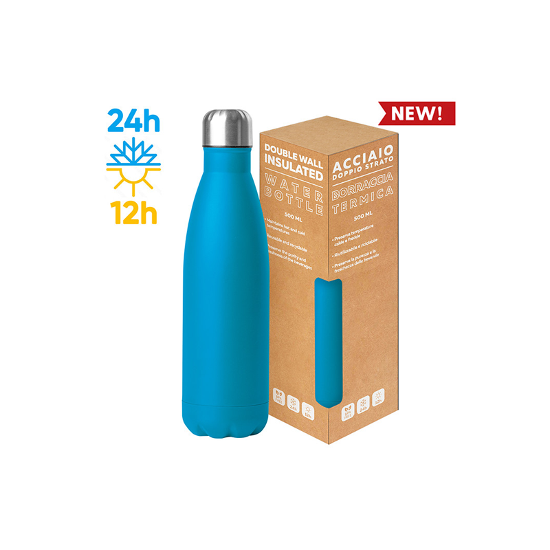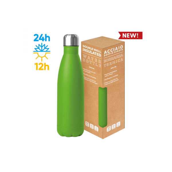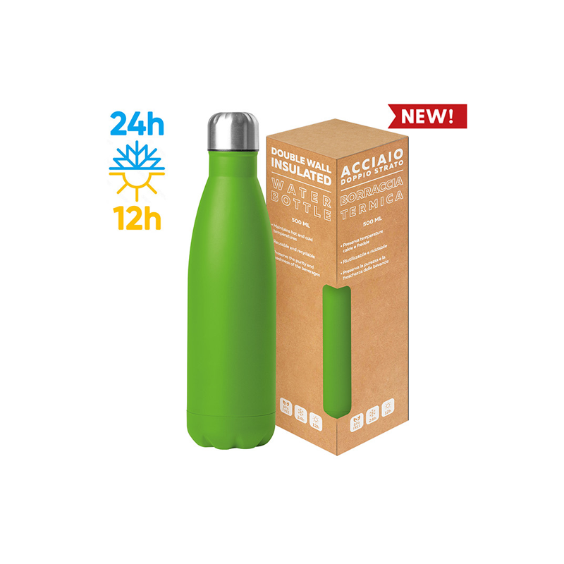 Borraccia termica in acciaio inox 500 ml, finitura lacca opaca, doppio strato (304-201), tappo in acciaio inox.