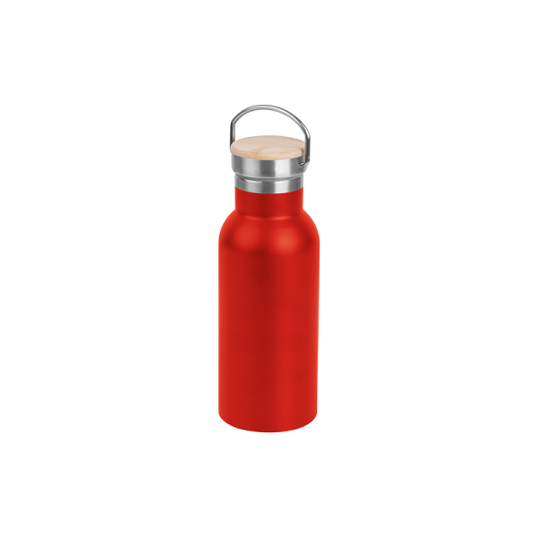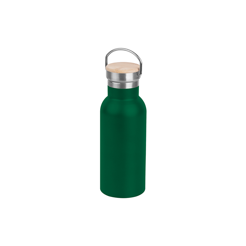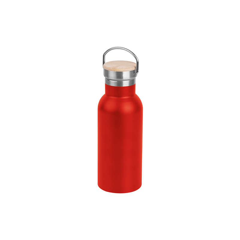 Borraccia in acciaio inox 304/201 in doppio strato, tappo in bamboo ed acciaio, rifinitura opaca.