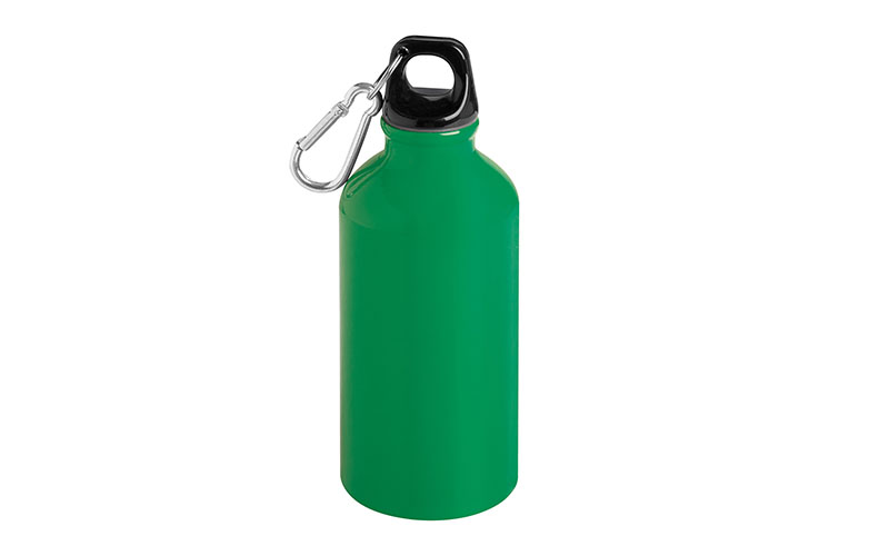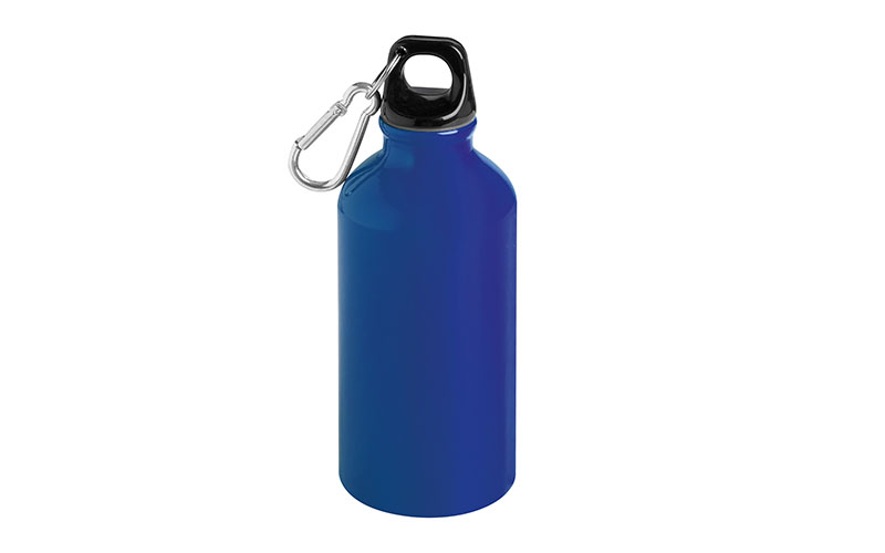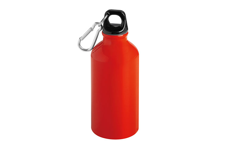 Borraccia 500 ml in alluminio, moschettone in metallo, tappo di sicurezza avvitabile, rifinitura lucida.