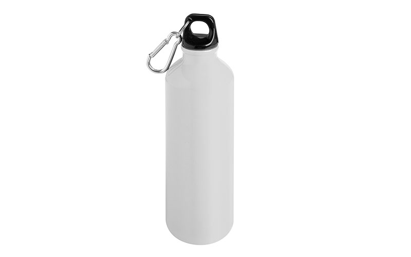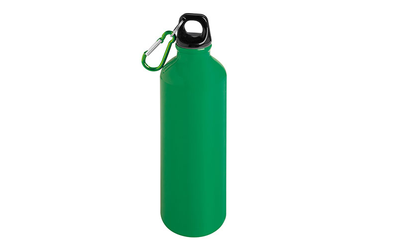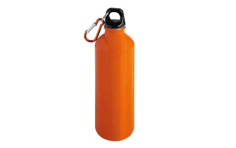 Borraccia 750 ml in alluminio, moschettone in metallo, tappo di sicurezza avvitabile, rifinitura lucida, astuccio.