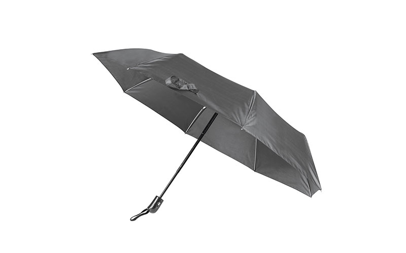 Mini ombrello in nylon taffetà 170T, apertura e chiusura automatica, 3 sezioni antivento, fusto in metallo nero, struttura in fibra di vetro, laccio da polso, rib in metallo temperato e rinforzato, manico in plastica, chiusura con velcro