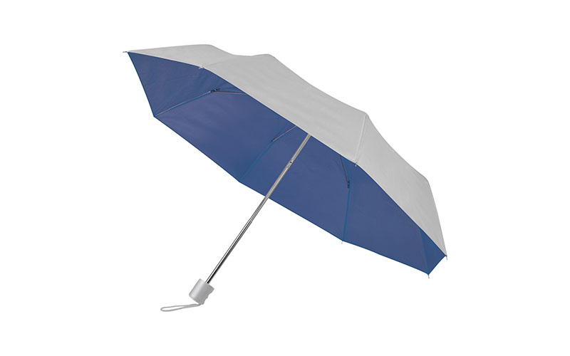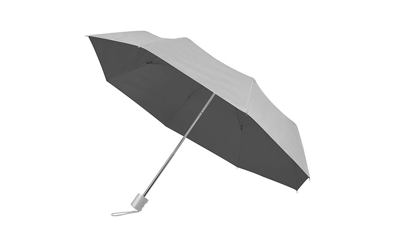 Mini ombrello in nylon taffetà 170T, apertura automatica, 3 sezioni interno a contrsto, fusto in metallo nero, laccio da polso, manico in plastica silver antigraffio, chiusura con velcro